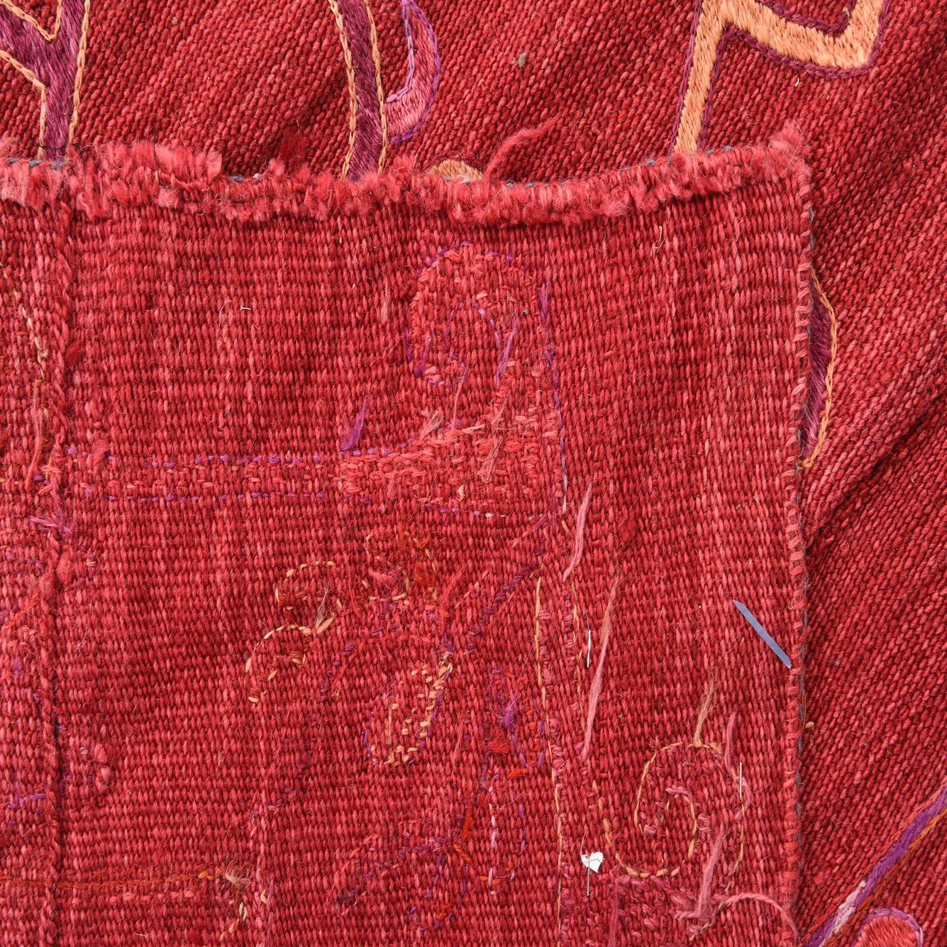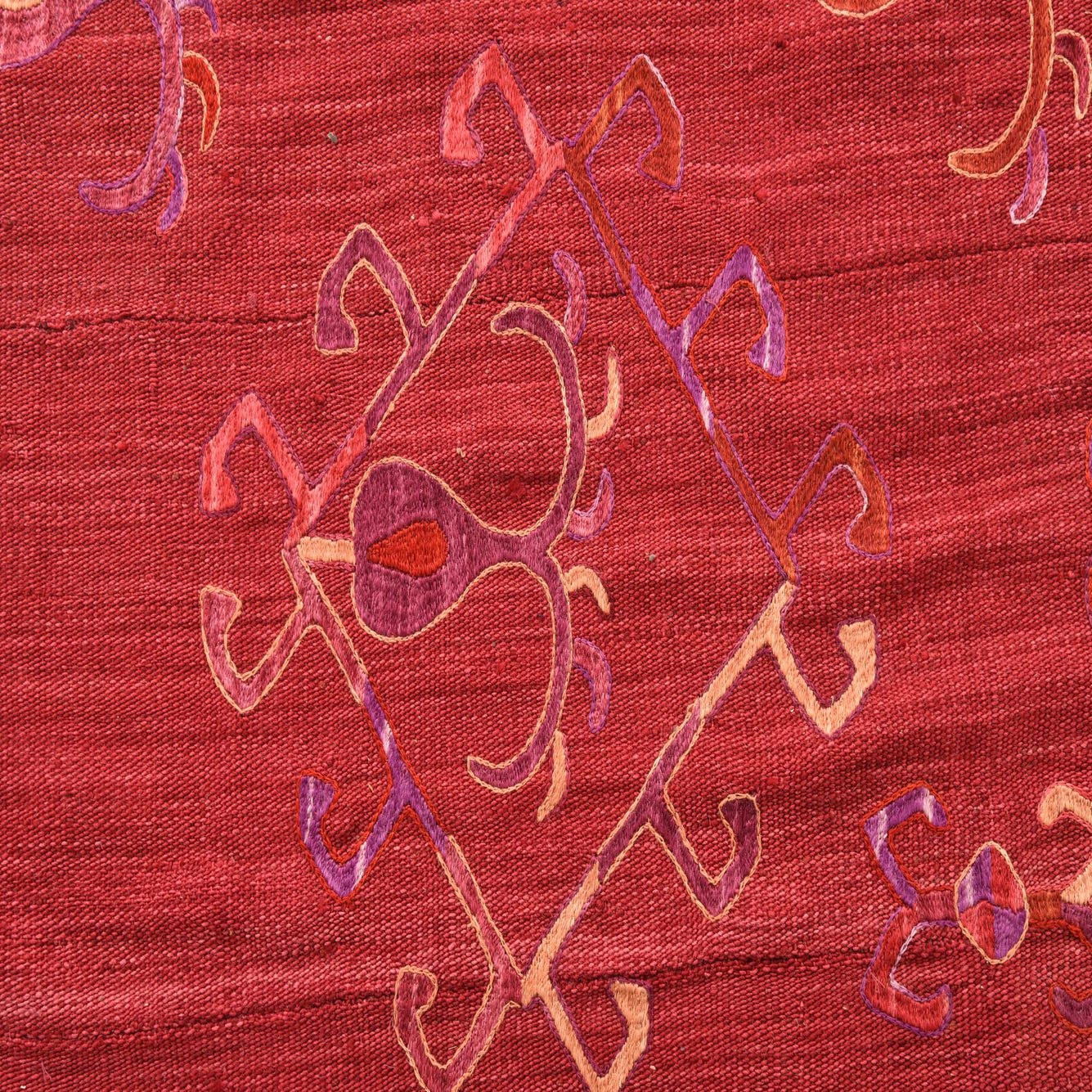 This piece's ornate design displays botanical motifs and emblematic symbols arranged in a symmetrical layout that complements both contemporary and traditional interiors. The vibrant hues lend themselves to spaces that feature neutral tones, allowing the rug to serve as a visual anchor and bring warmth and depth to a room. It is ideal for living rooms, dining areas, or office spaces seeking a touch of artisanal charm and cultural flair. The Kilim Suzani rug is a versatile choice, integrating effortlessly into bohemian, eclectic, or global-inspired interiors.