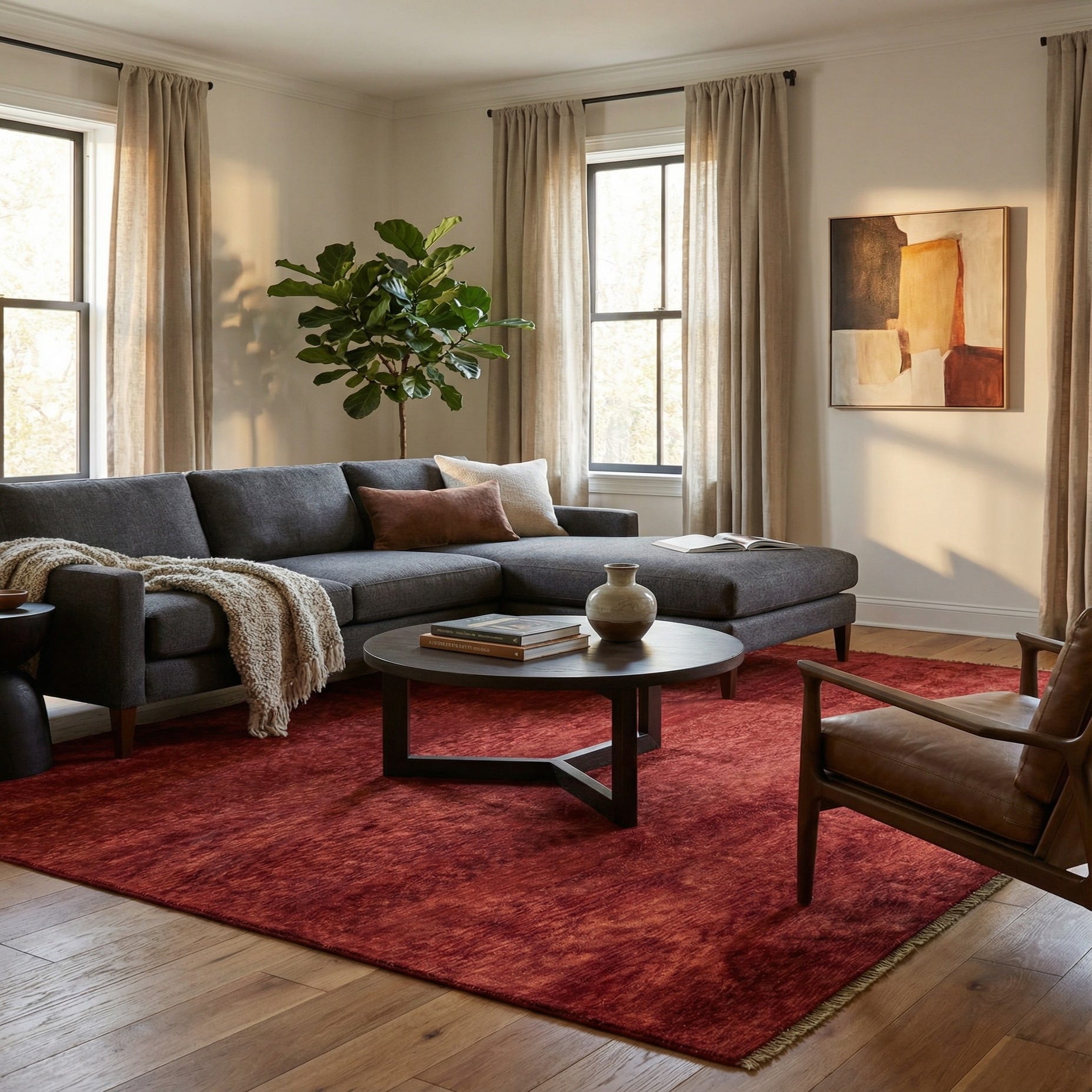 A 5x8 rectangular Modern Ziegler rug in deep reds and purples, featuring a subtle variegated pattern and thin pile.