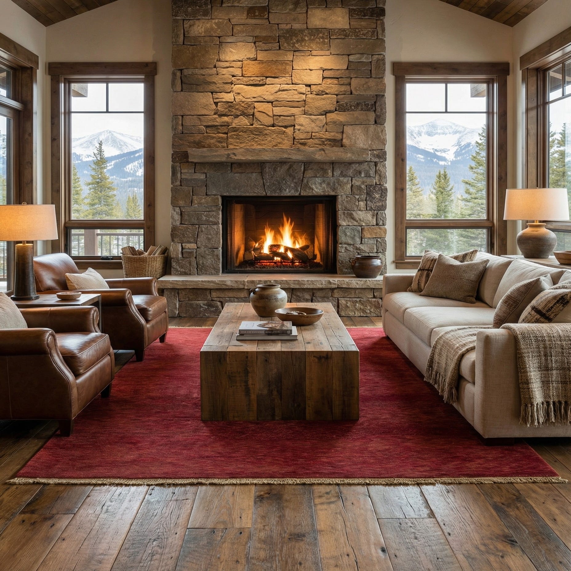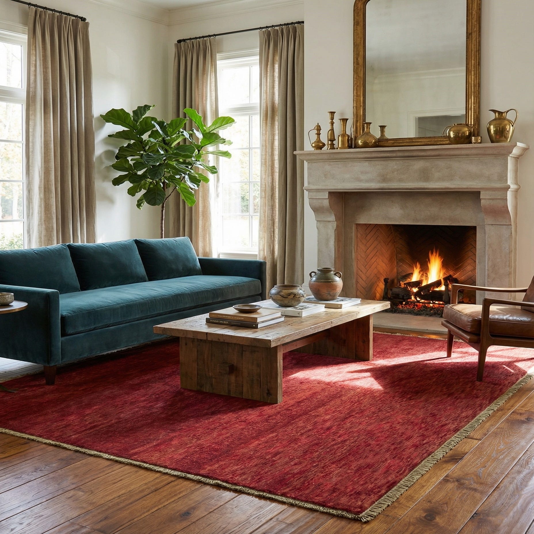 A 5x8 rectangular Over-Dyed Ziegler rug in rich purple and red tones, made of hand-spun wool with a thin pile.