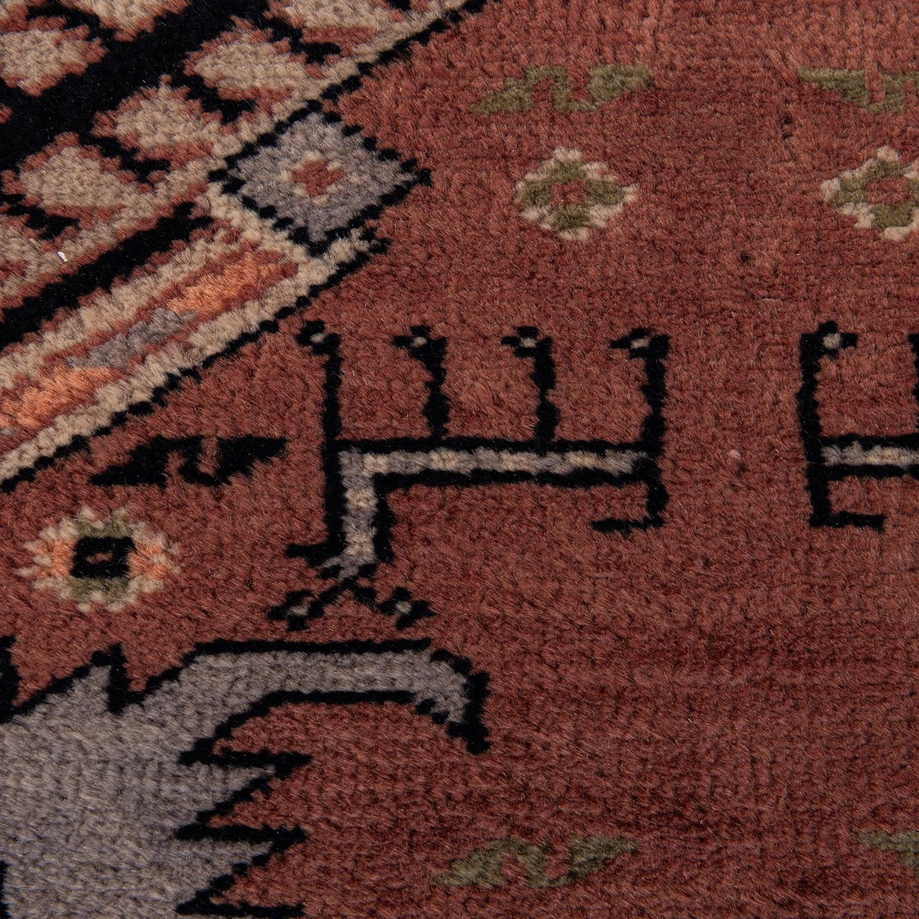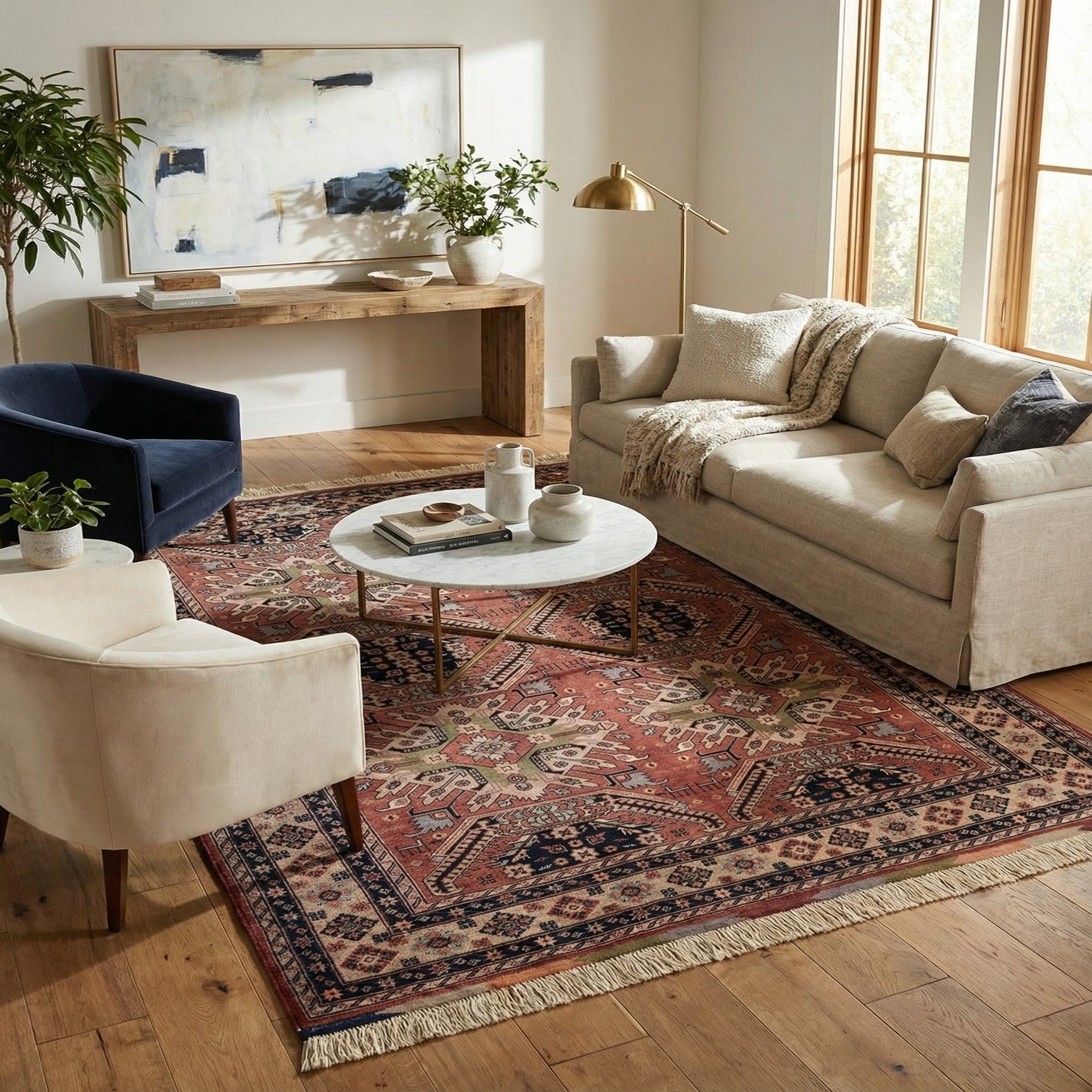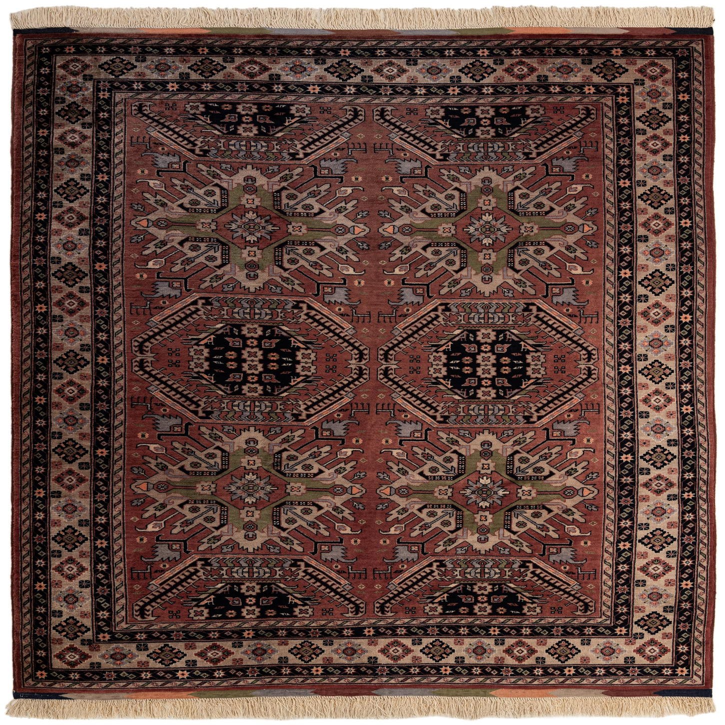 Hand-knotted in 100% wool, the rug has a tactile, grounded feel: a dense, tightly knotted pile that is soft to the touch yet substantial underfoot, with a low natural nap that highlights the design details. It works well anchored beneath a living room seating group or layered in a study or library with warm wood furniture and leather or linen upholstery. The palette pairs nicely with neutral walls, deep wood tones, and muted metallic accents, and it can also provide a traditional counterpoint in more contemporary or mid-century settings.