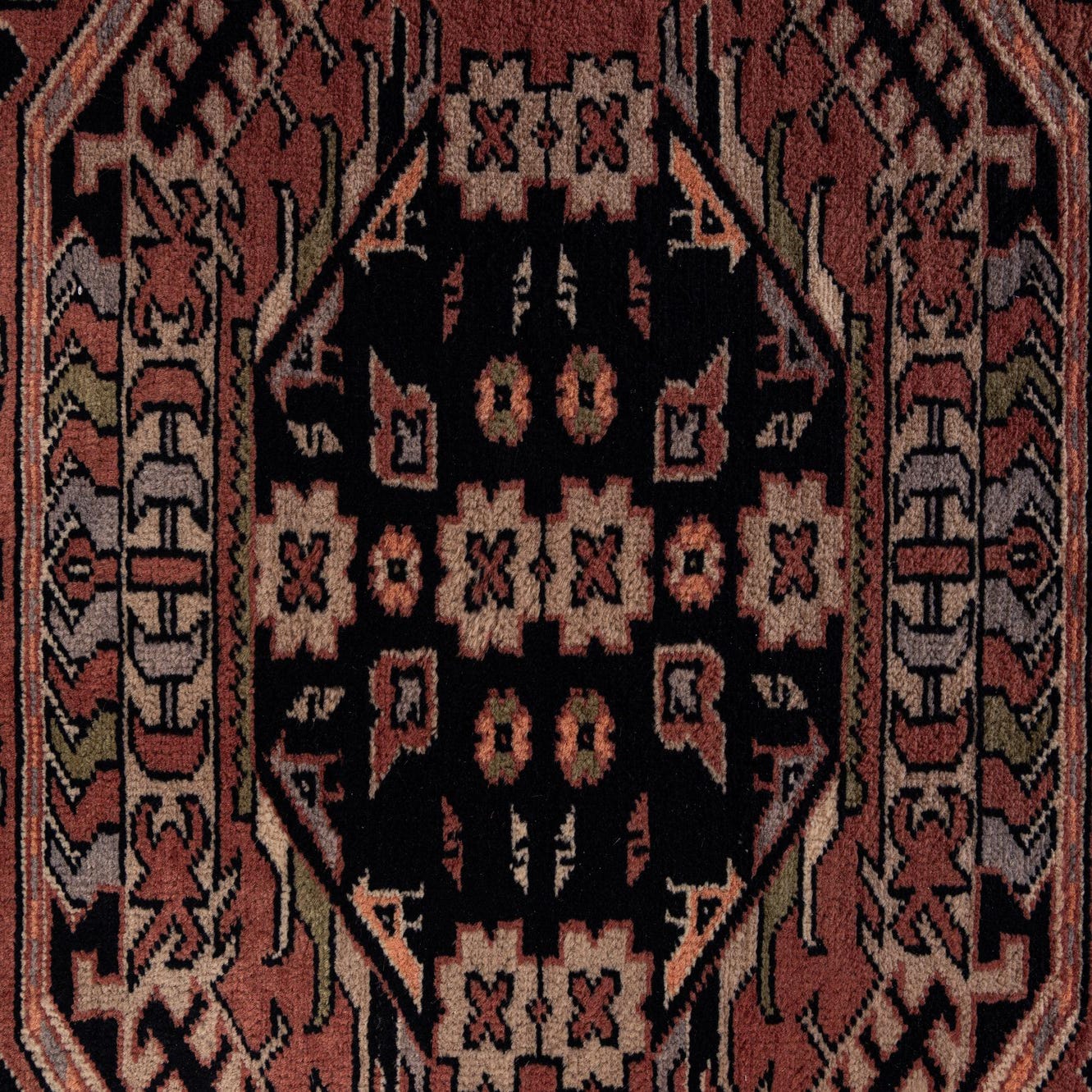 Primary color is Plum Red. Colors in this rug include: Plum Red, Beige, Black, Blue, Brown.