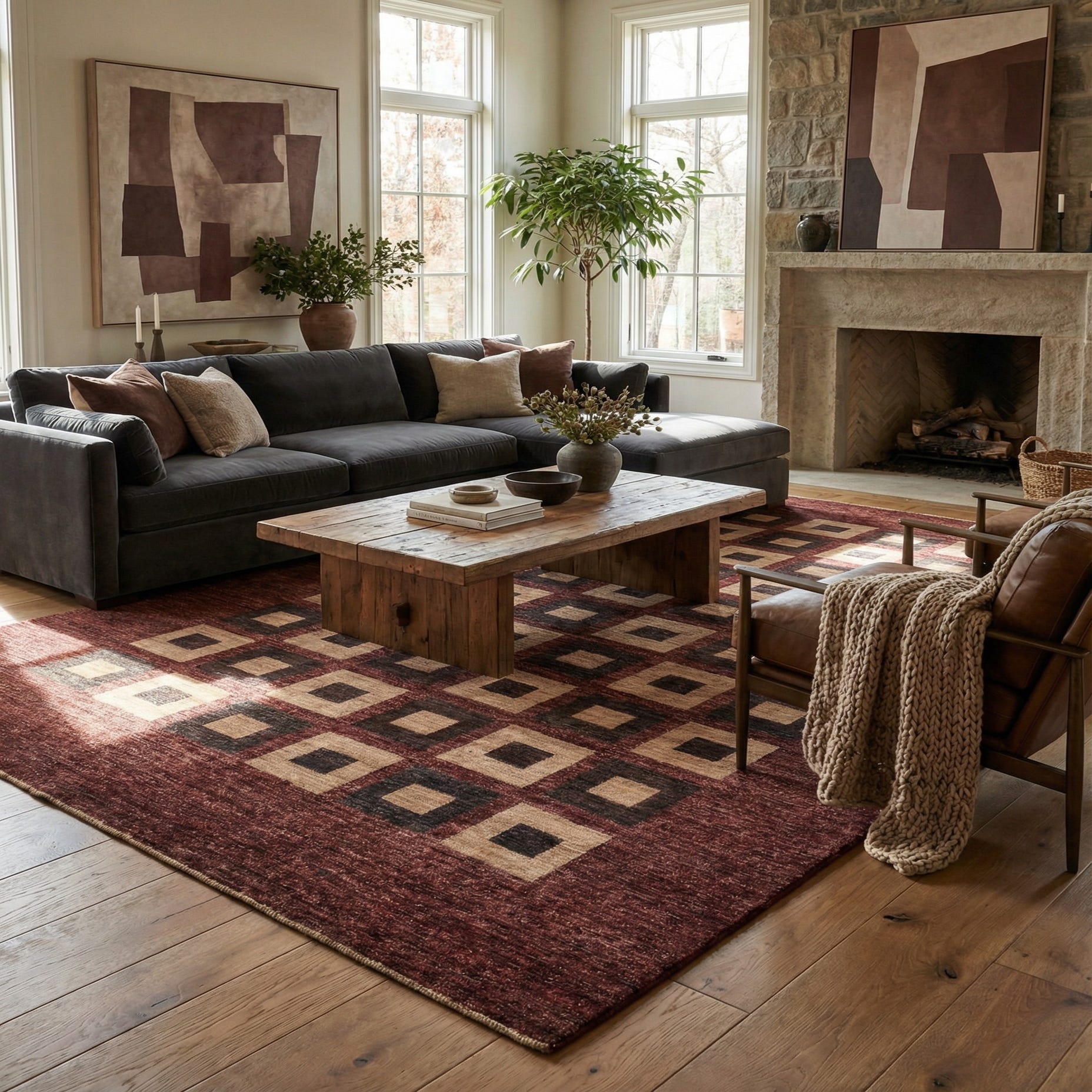 A 7x10 rectangular Modern Ziegler rug with a deep red border and a central grid pattern of alternating tan and dark brown squares.