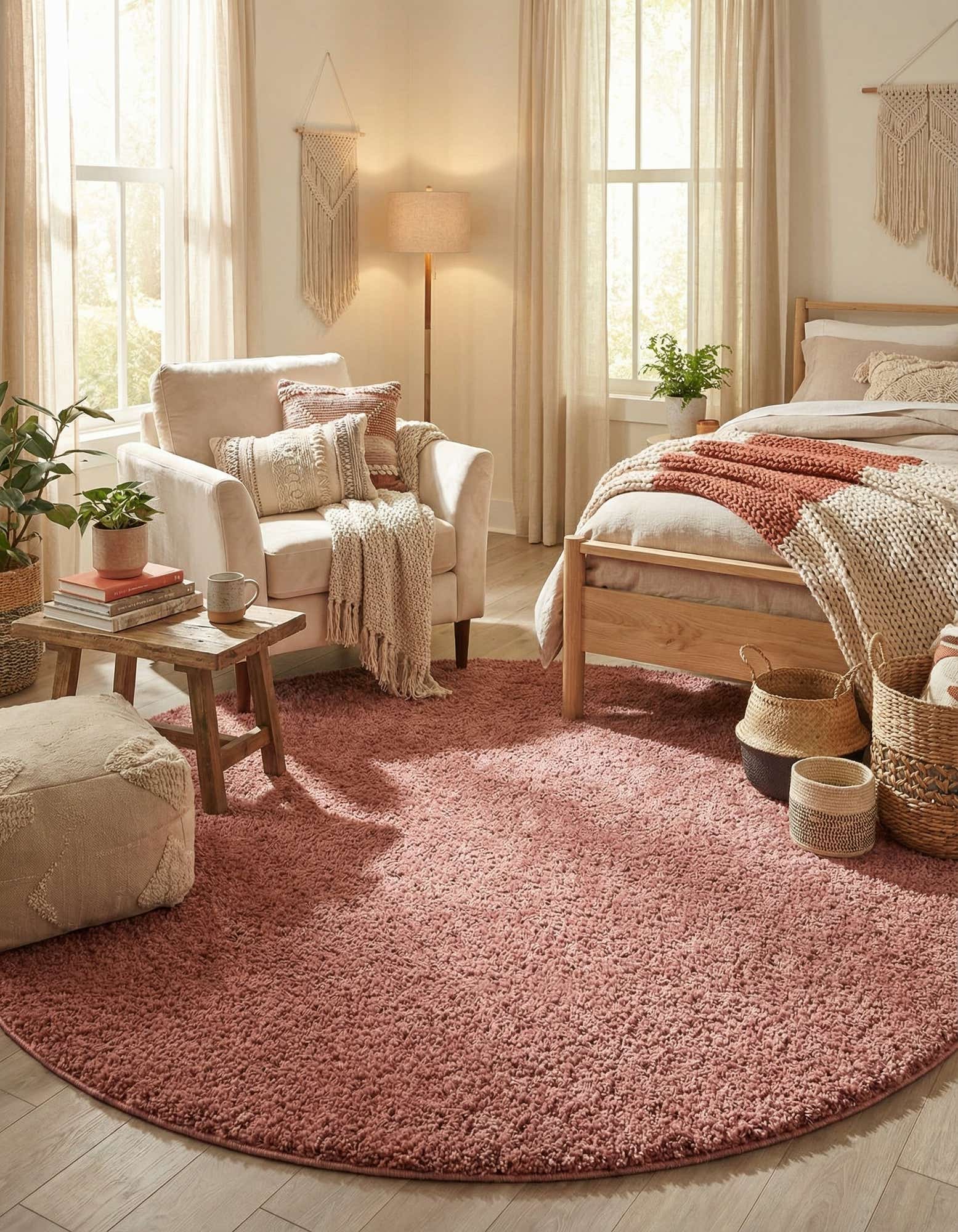 This piece works well as a color anchor in a living area to define seating, beneath a round dining table to add warmth, or layered in a bedroom seating nook for extra softness. It pairs nicely with warm neutrals and natural woods for a relaxed look, brass or black metal accents for a modern contrast, or mixed textures and patterned cushions in bohemian and transitional interiors.