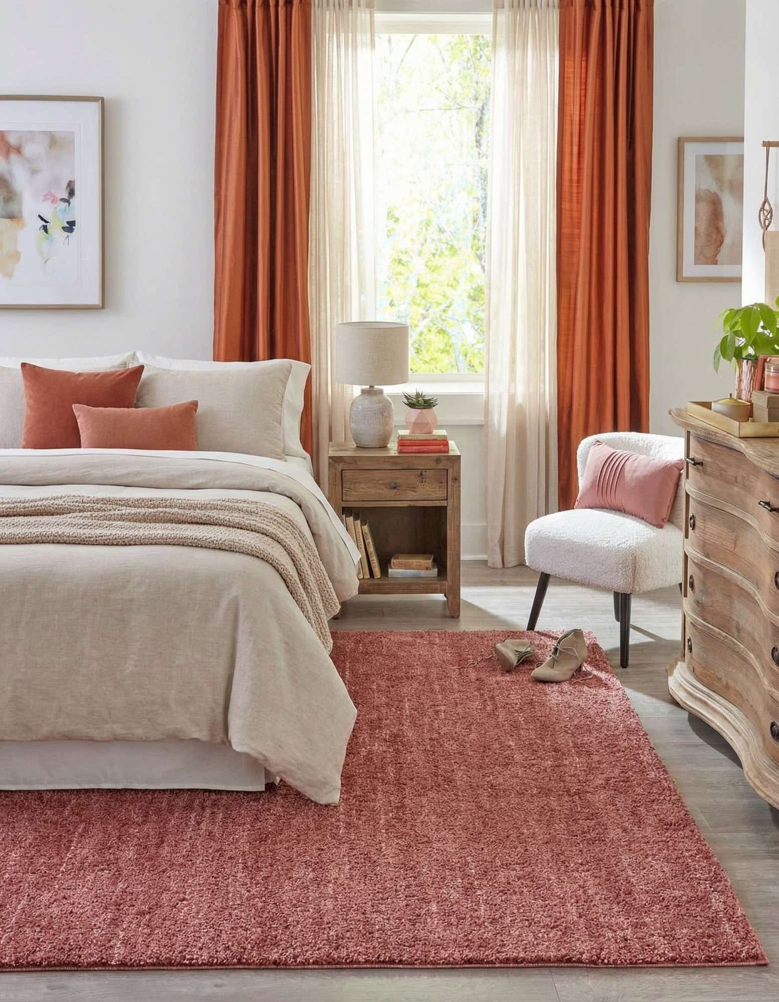 The shaggy pile feels soft and inviting underfoot, with a plush, cushiony texture that adds warmth to hardwood or tile floors. It works well anchoring a living room seating group, layering under the lower two-thirds of a bed for a cozy bedroom setup, or softening a media or reading nook. Pair it with warm wood tones and brass accents for a rich, pulled-together look, with neutral upholstery to let the pomegranate hue take center stage or with jewel-toned accents for a more dramatic palette.