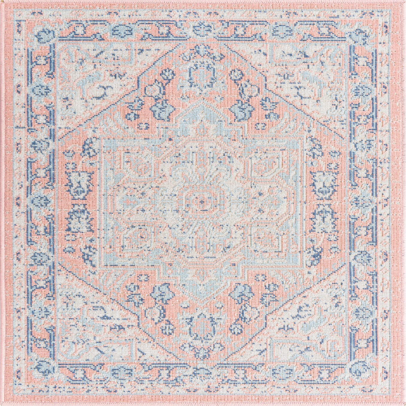 Primary color is Powder Pink. Colors in this rug include: Powder Pink, Blue, Light Blue, Ivory.