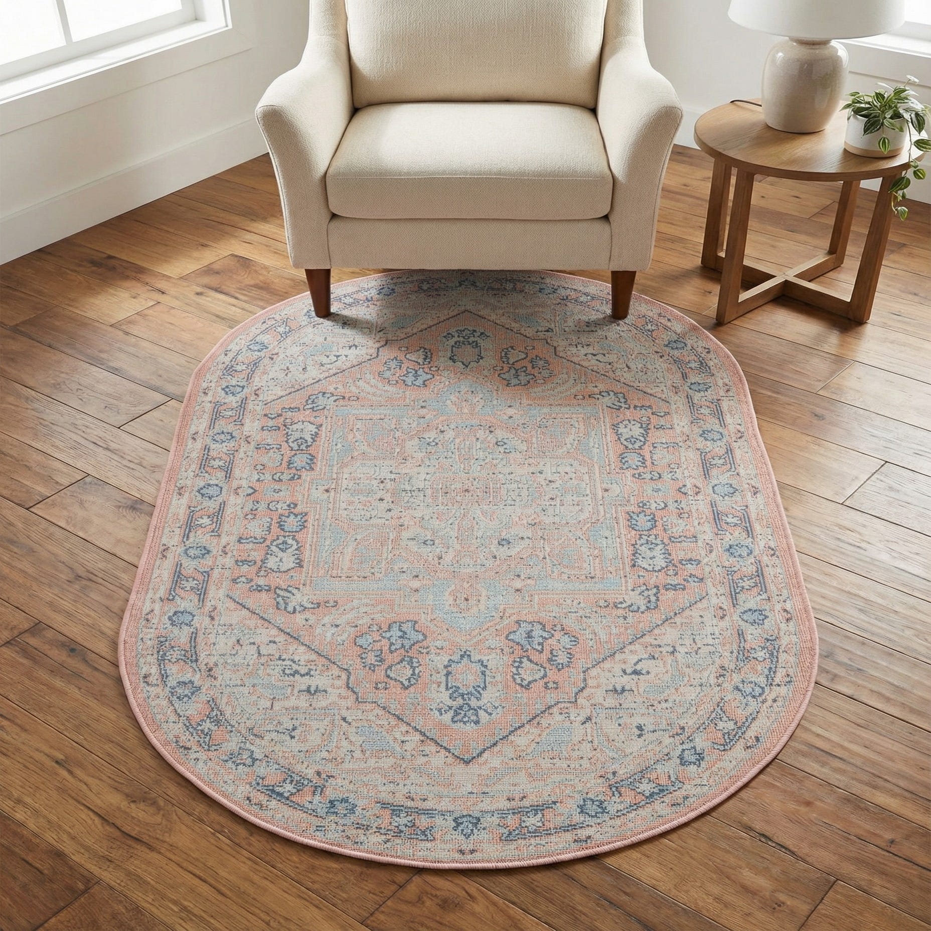 A soft powder pink field sets the tone for a vintage-inspired medallion design rendered in shades of blue, light blue and ivory. The oval layout frames an intricate central motif with scrolling floral and arabesque accents that flow into a repeating border, while a gently distressed finish gives the pattern a lived-in, layered look. The overall effect blends traditional Persian influences with a relaxed, contemporary palette.