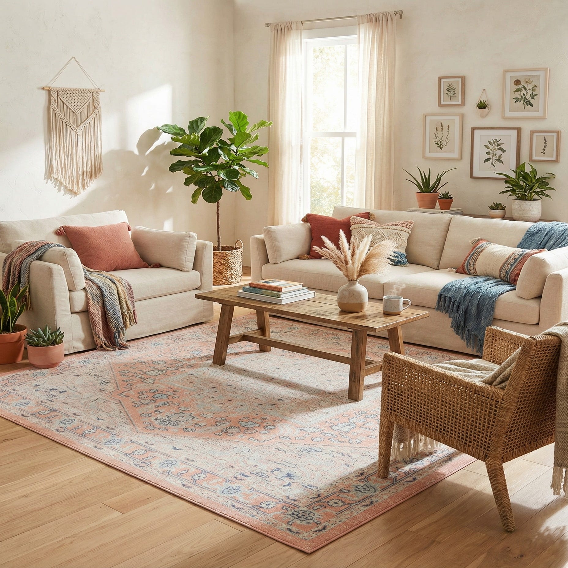 Machine-made from 100% polypropylene, the rug has a low, even pile that feels smooth underfoot with a subtle, satiny sheen where the fibers catch the light. The pattern reads with gentle depth rather than high texture, making it easy to layer beneath seating or a bed. Pair it with light wood furniture and ivory upholstery for a coastal or cottage feel, use it to soften a contemporary living room with muted pastels, or place it in a bedroom or nursery to introduce a calm, feminine palette.