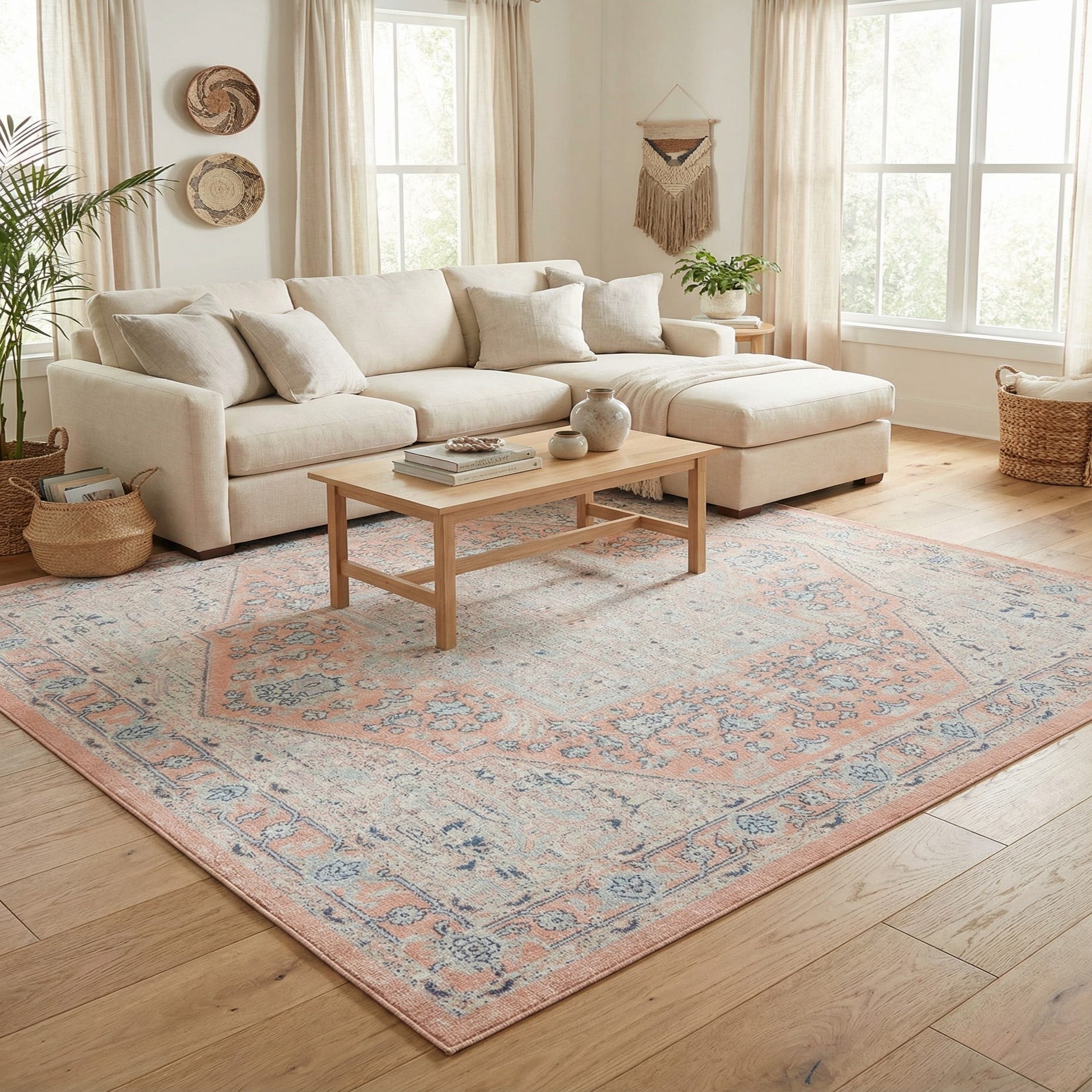 A softly distressed medallion pattern anchors this piece, with an octagonal central motif worked in powder pink and framed by delicate floral and arabesque details in blue, light blue, and ivory. The powder pink background gives the rug a warm, airy presence while the lighter ivory field and cool blue accents create a layered, vintage-inspired look. A narrow decorative border echoes the interior motifs, adding structure without heaviness.