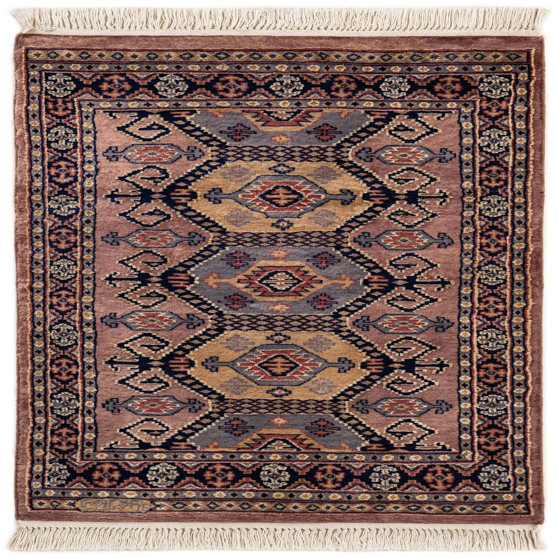 A 3x4 rectangular Bokhara rug with a purple field, featuring traditional tribal patterns in gold, navy, and red, finished with white fringe.
