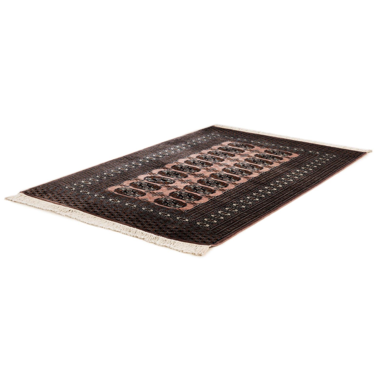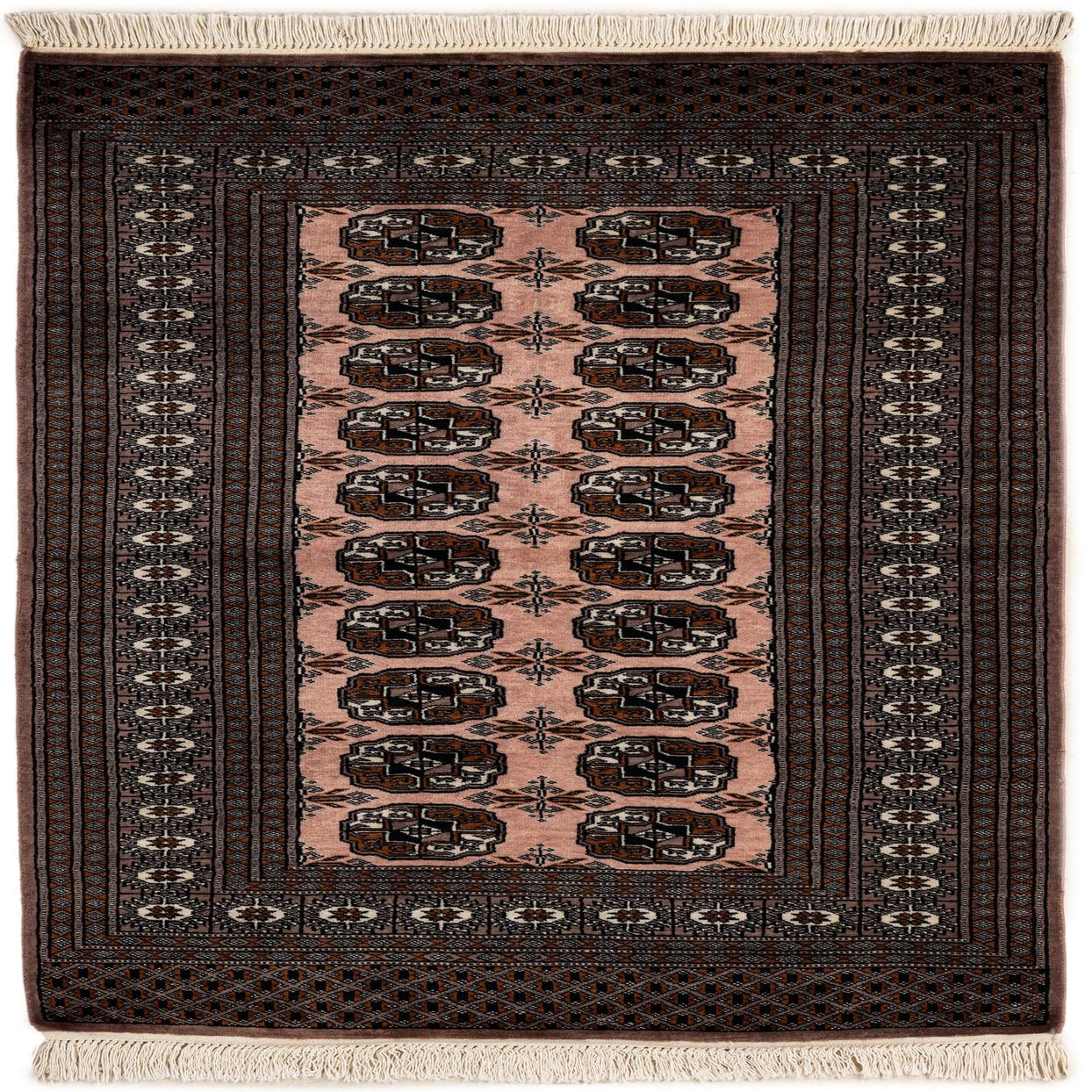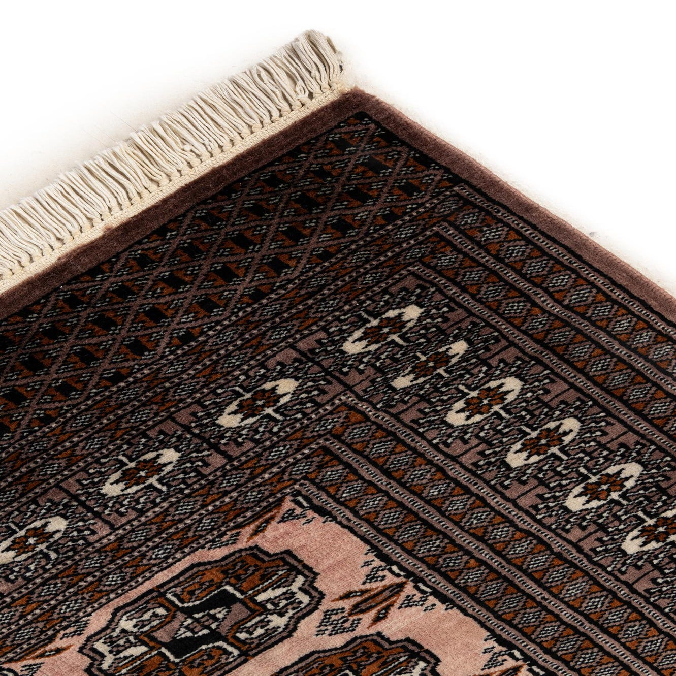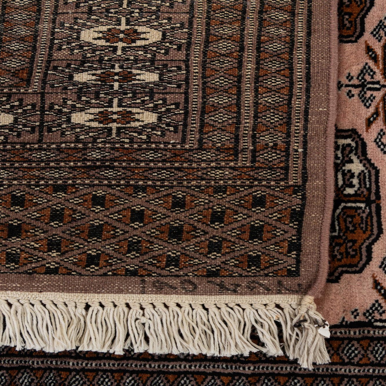 A 3x5 rectangular Bokhara rug in shades of purple with a traditional tribal pattern and fringe.