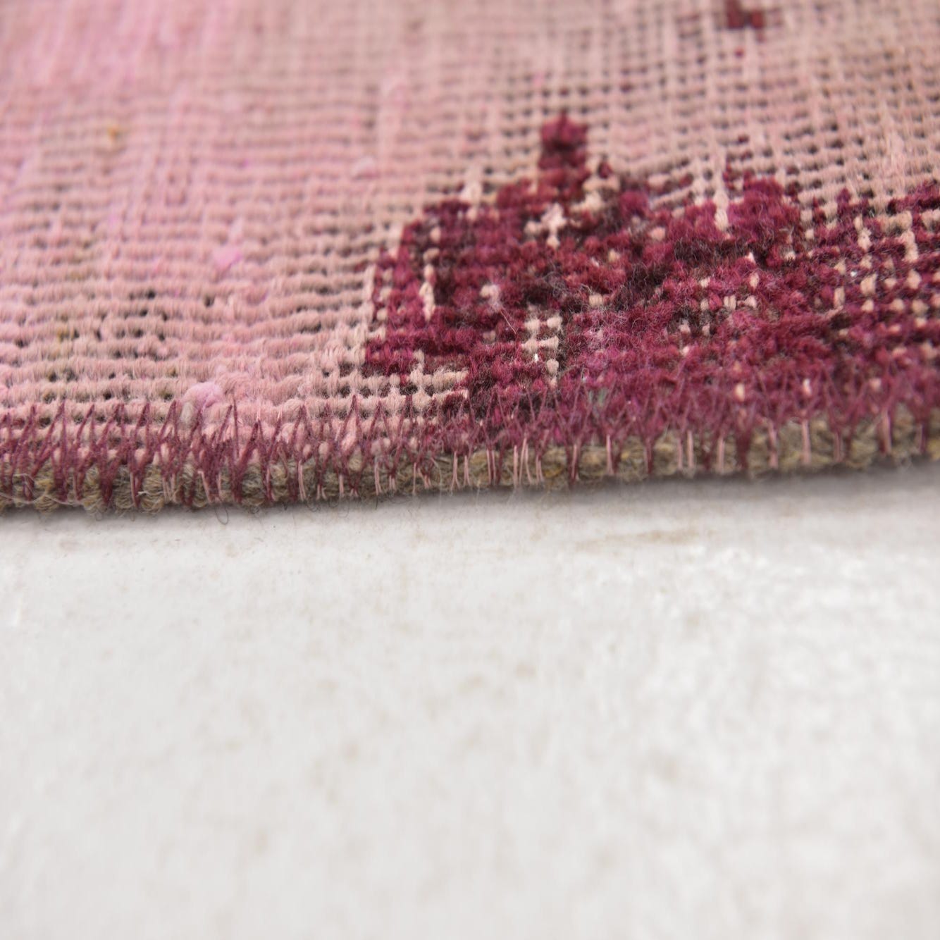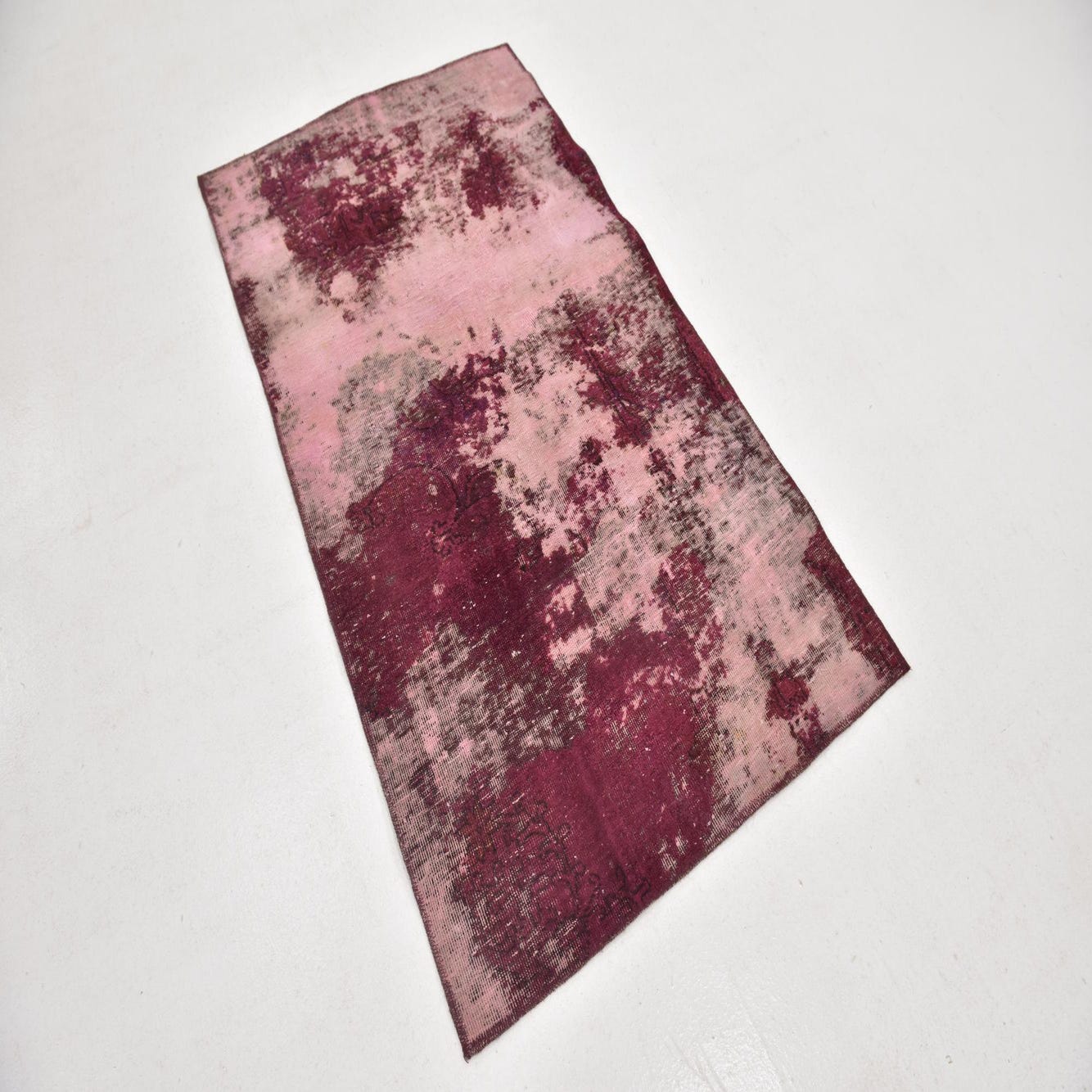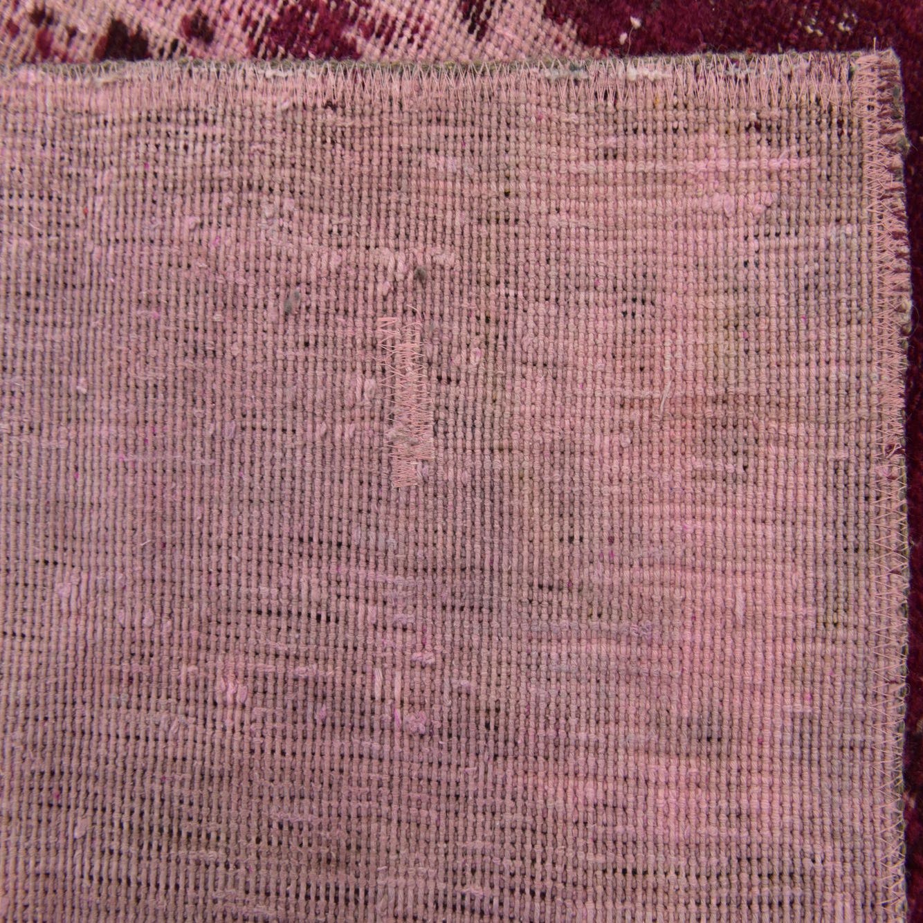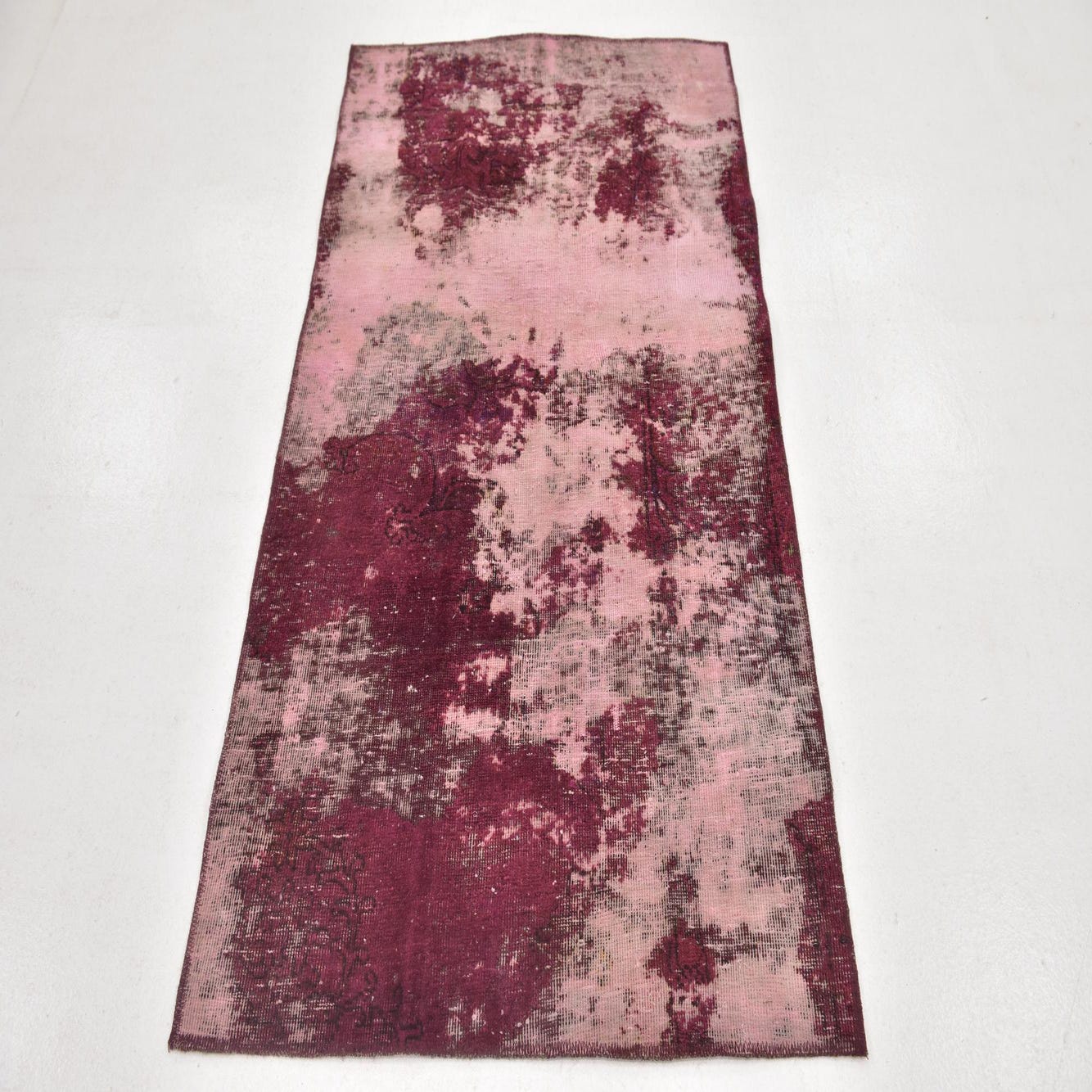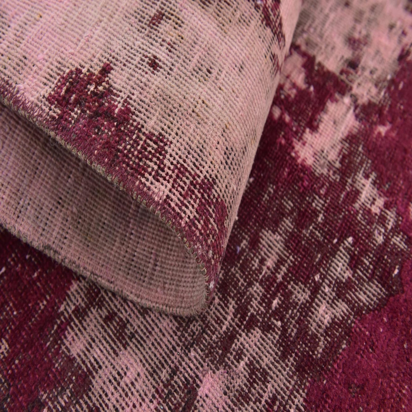The rug's pattern displays a faded and abstract design, where bold splashes of burgundy, black, and red hues stand out against the puce background. This juxtaposition creates a visual depth and complexity that may remind one of a well-loved heirloom with a modern twist.