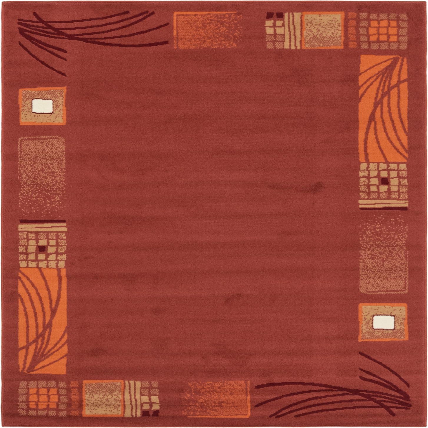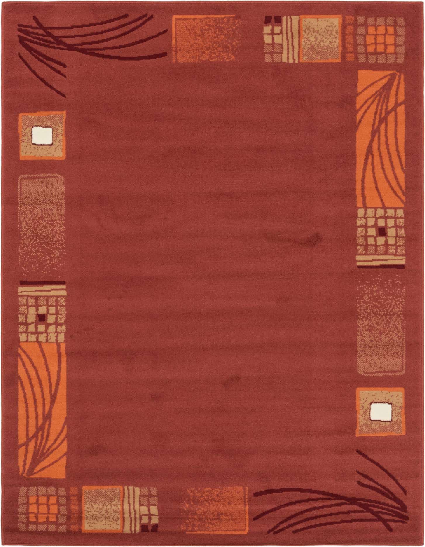 The Reproduction Gabbeh rug is a versatile 5x7 piece machine woven from polypropylene, ensuring both durability and ease of maintenance. The design features a puce background accented with an array of geometric and abstract motifs in a palette of beige, burgundy, ivory, and orange. The pattern exhibits a collection of framed square and rectangular elements alongside linear accents, creating a dynamic aesthetic within its borderless edges.