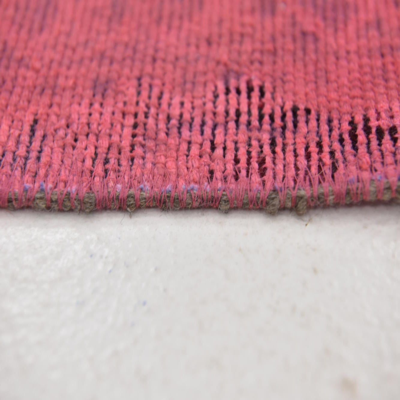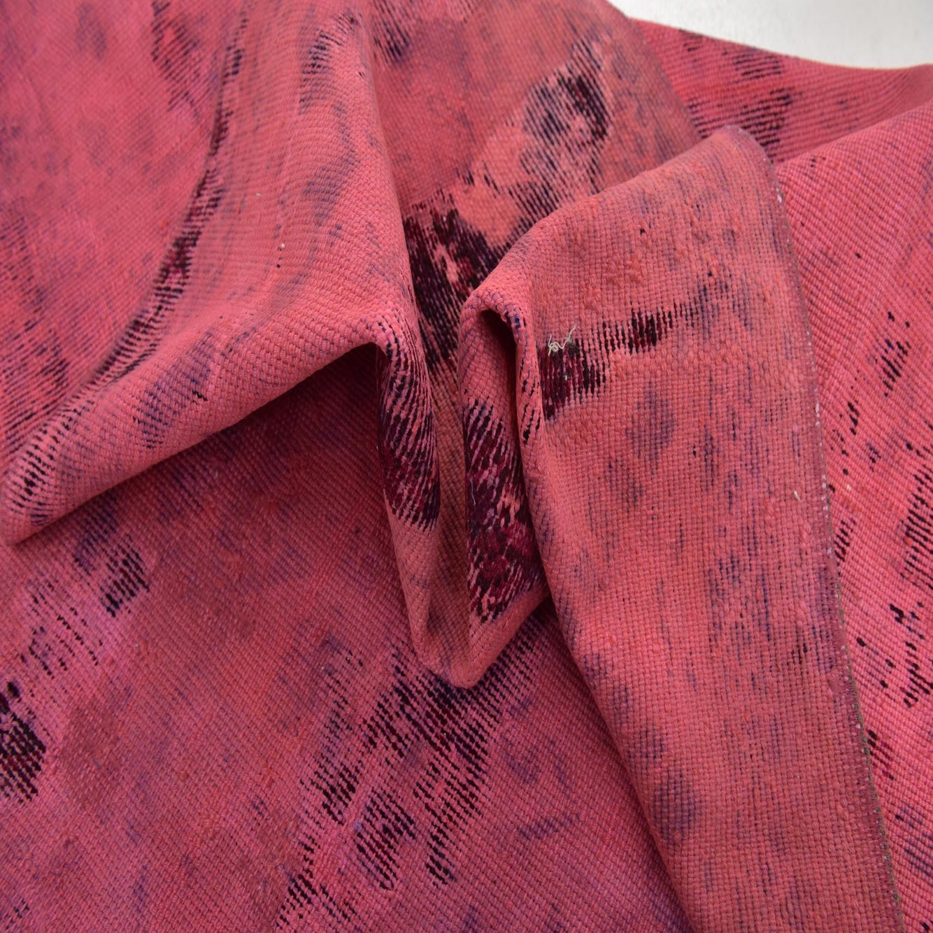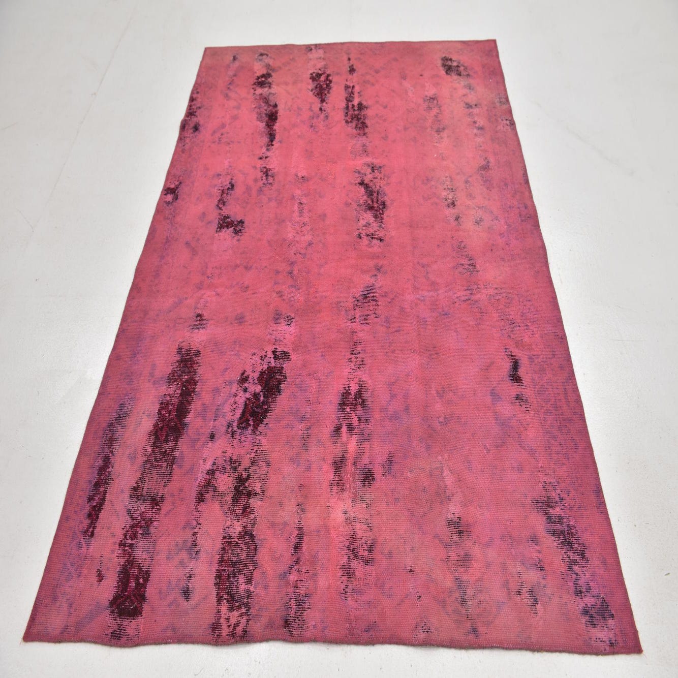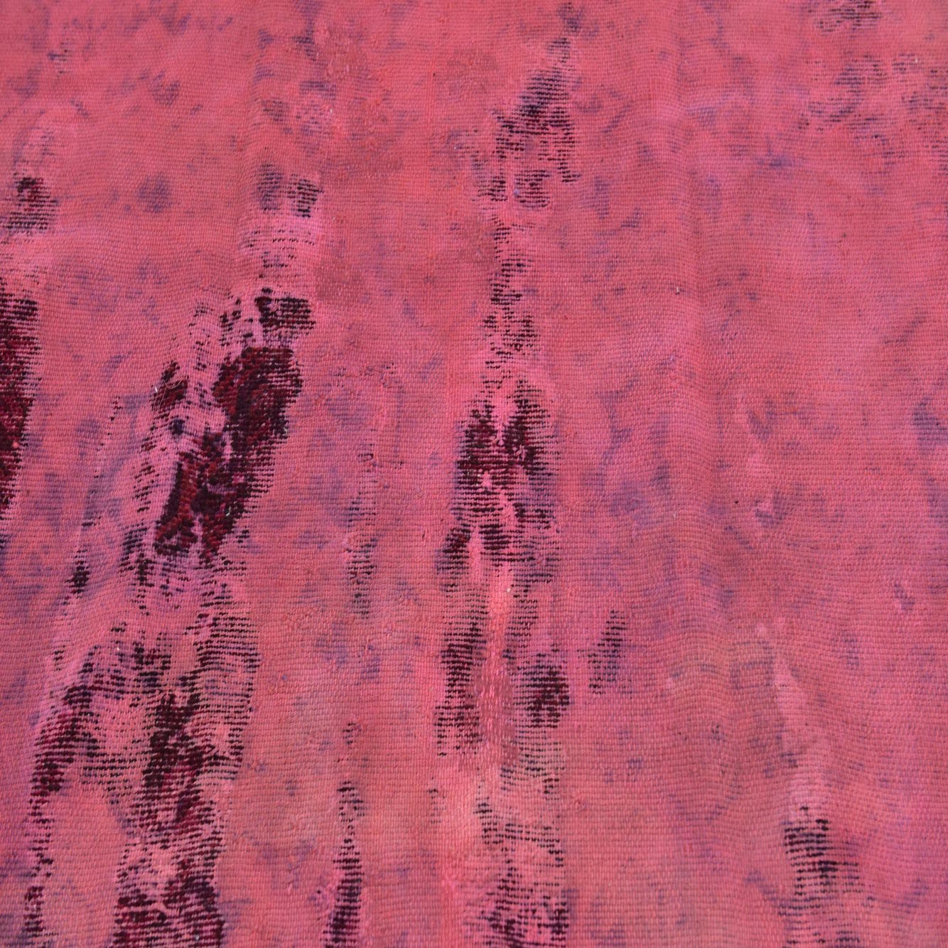 A soft puce field provides the base for an artful, worn look: vertical, painterly streaks of burgundy and black cut across the surface, with touches of red, pink and beige that settle into the weave like a vintage wash. Subtle, faded ornamental shapes lie just beneath the surface, creating depth and a layered patina. Hand-knotted in 100% wool, the surface feels supple underfoot with a low, even pile and slight variations in texture that catch the light and emphasize the rug’s handcrafted character.