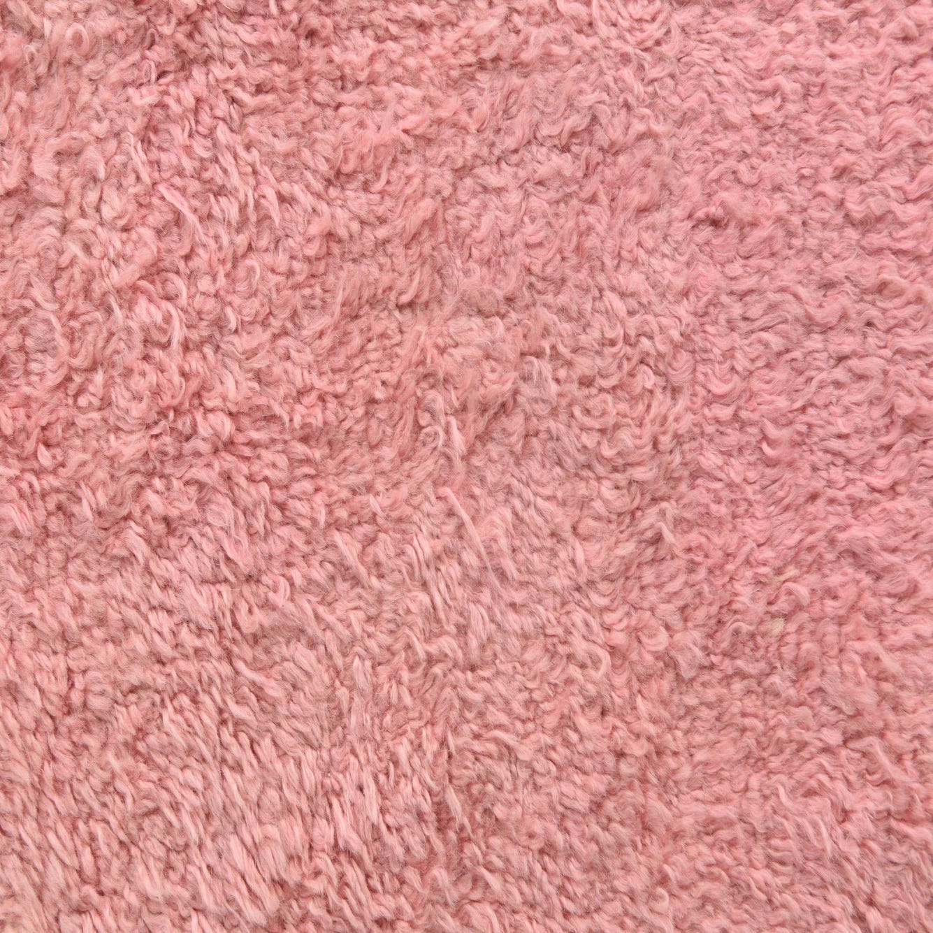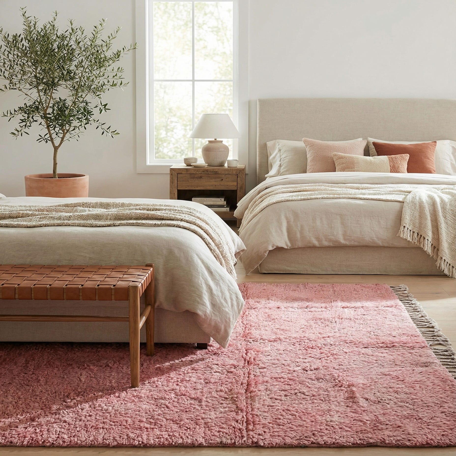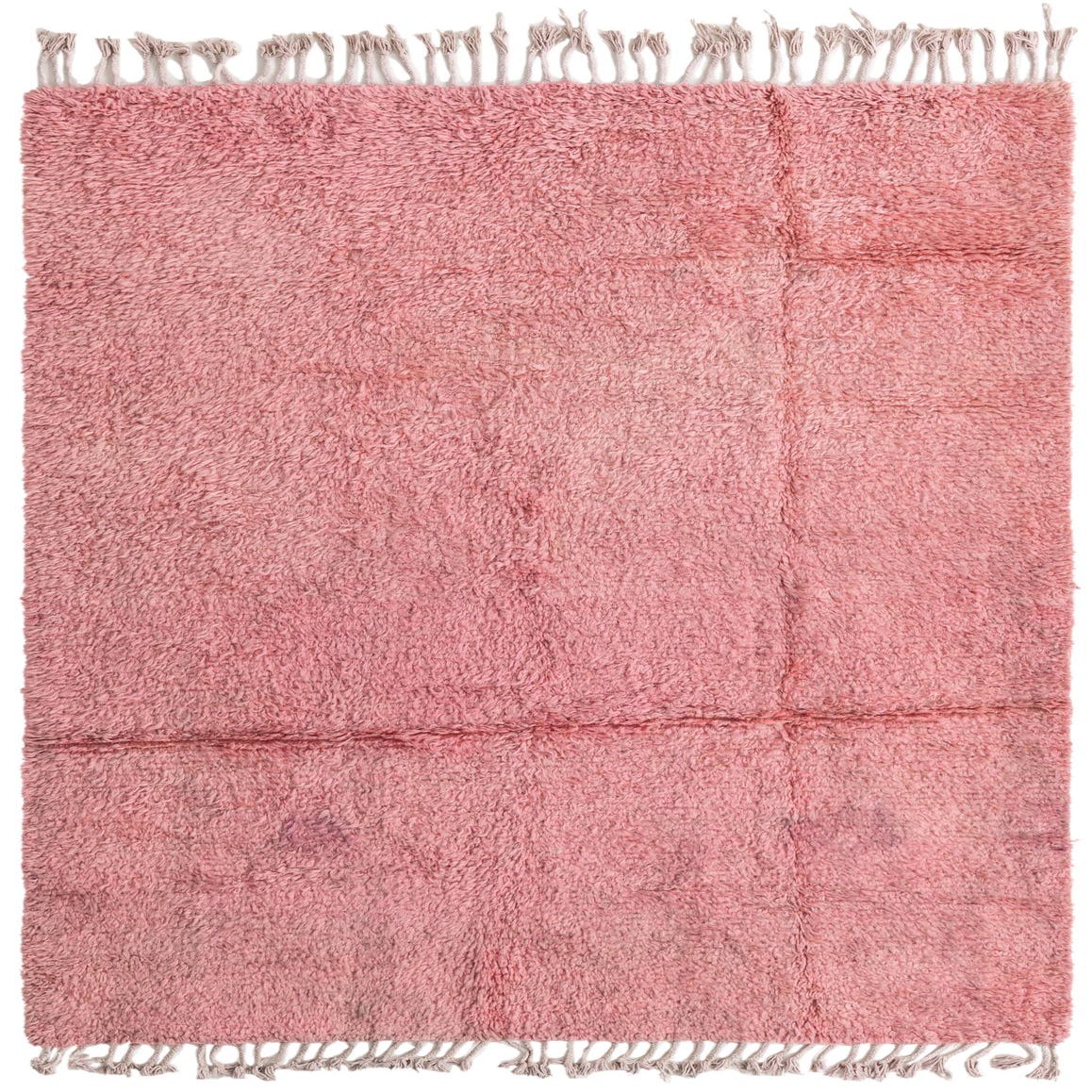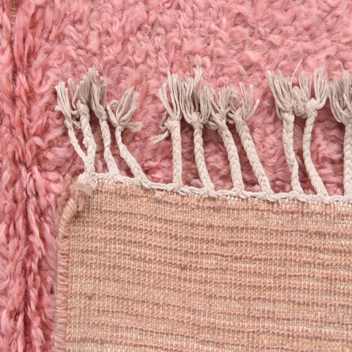 This Moroccan collection rug is hand-knotted from 100% wool, providing a naturally soft and durable surface. The piece measures 5x8, making it versatile for an array of room sizes. The rug's background is puce, a unique reddish-pink hue that offers warmth and a subtle, inviting ambience. It features a minimalist design with visible weave lines that create a simple yet effective pattern. This textured surface adds depth and interest to the rug, while the fringed edges provide a traditional finishing touch.
