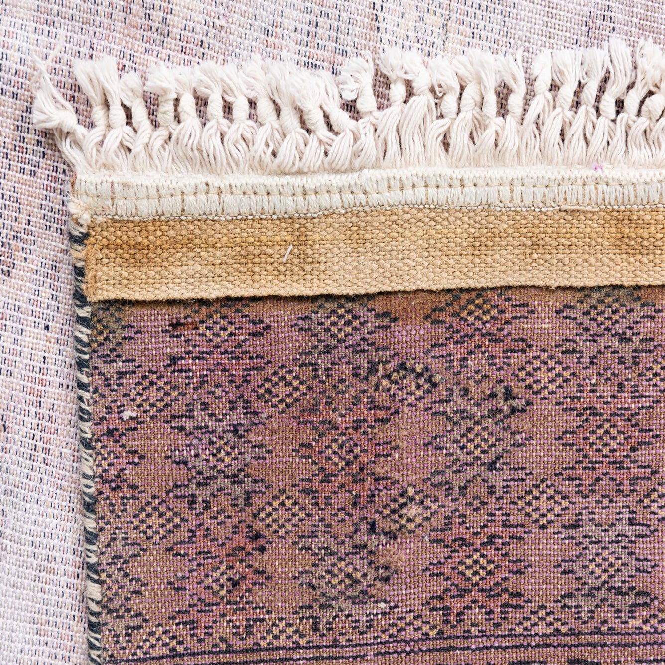A 5x8 rectangular purple and white vintage-style Persian rug with a faded medallion pattern and fringe.