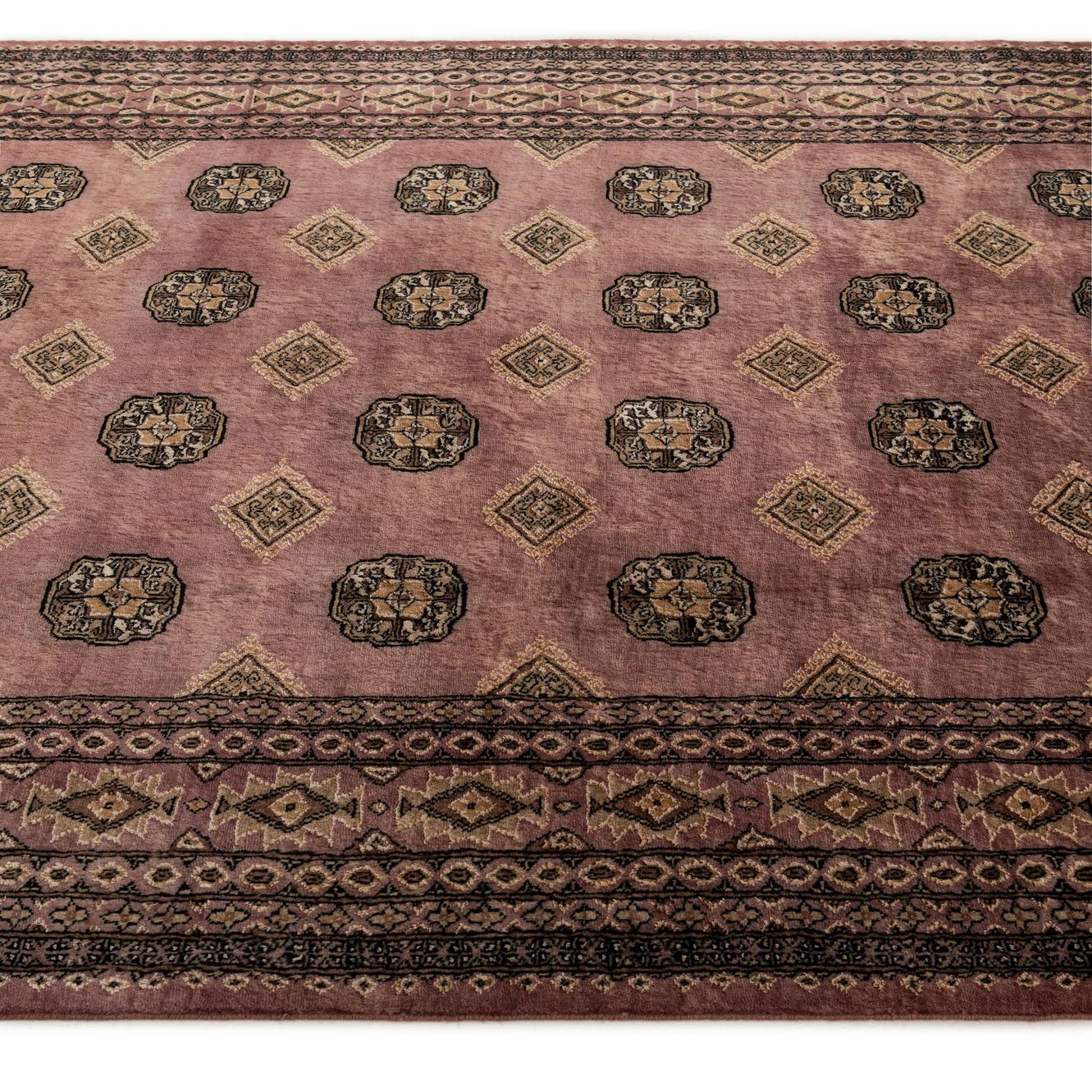 A 6x9 rectangular Bokhara tribal rug in rich purple with intricate black and gold traditional patterns and a fringed edge.