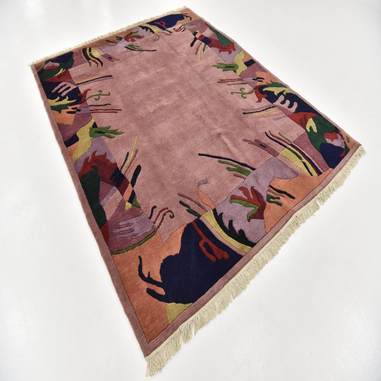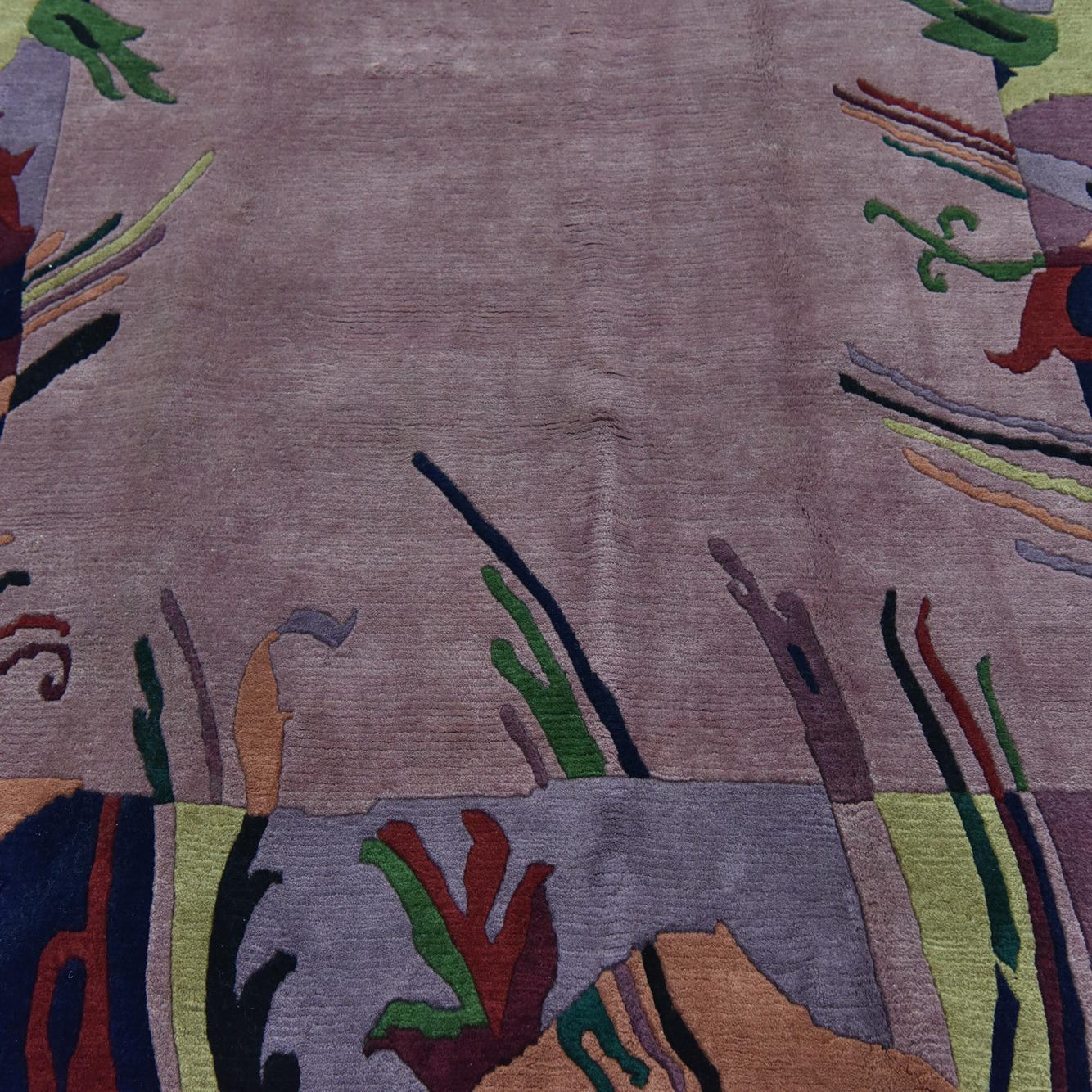 A 6x9 rectangular purple wool rug with a high pile, featuring a modern abstract border in various colors.
