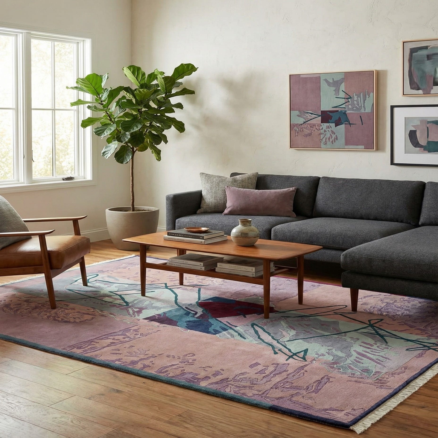 This piece works well as an anchor for a modern or transitional living area—place it beneath a sofa and coffee table to define a seating group and echo the rug’s blue and green accents in pillows or a throw. It also complements mid-century and eclectic interiors when paired with warm wood furniture, brass or matte-black metal accents, and artful textiles in ivory, slate, or deep red. In a bedroom or entry, the rug brings color and a layered, gallery-like feel without overwhelming a room’s other elements.