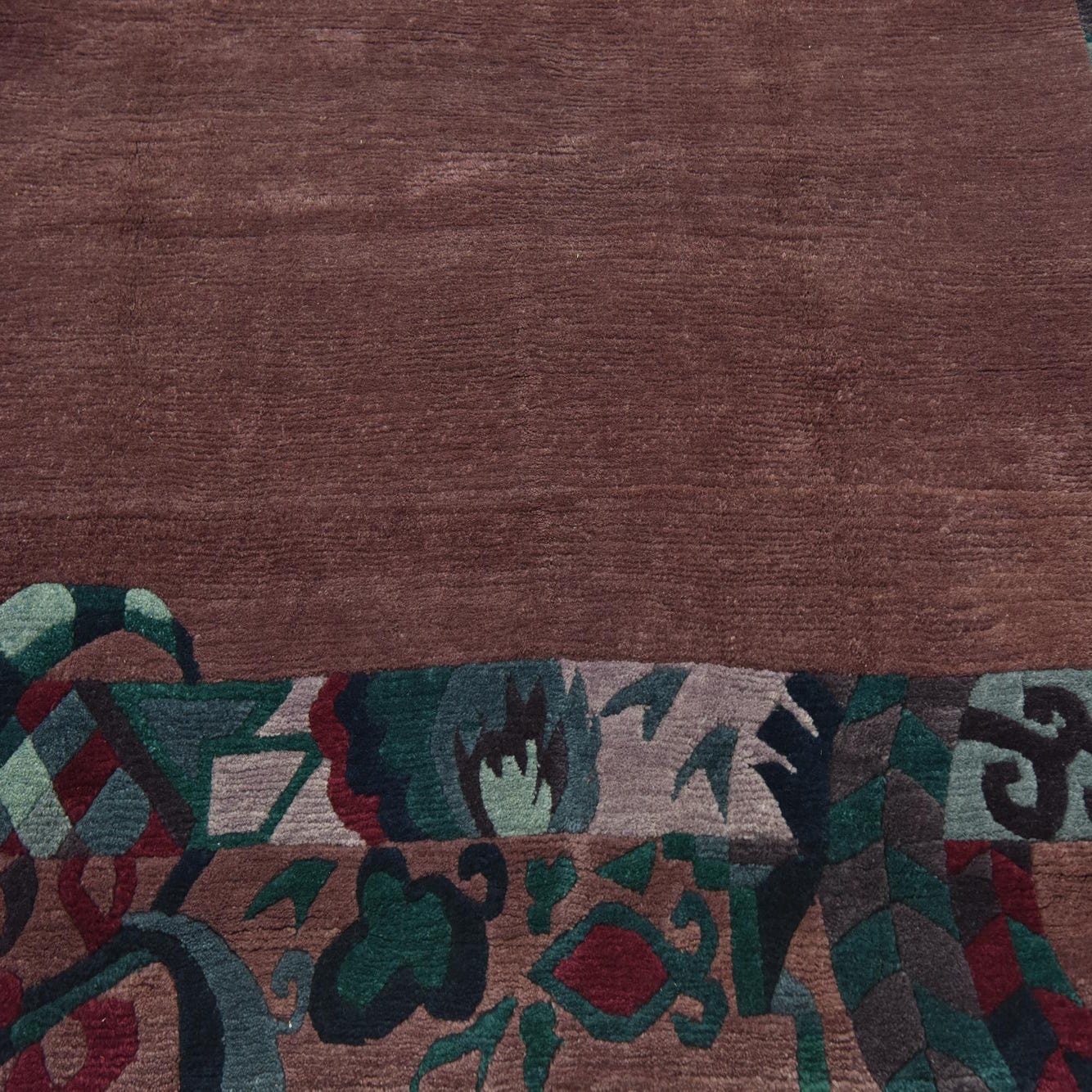 Primary color is Puce. Colors in this rug include: Puce, Blue, Brown, Gray, Green, Navy Blue, Violet, Red, Purple.