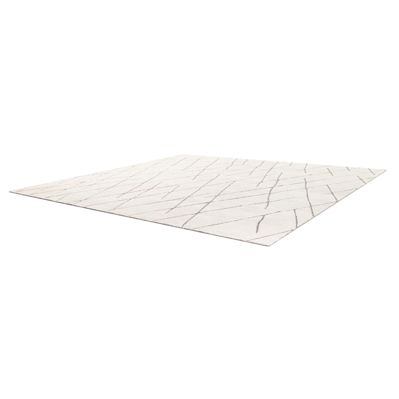 A square ivory and cream area rug with a modern tribal pattern of intersecting grey lines, suitable for an indoor living space.