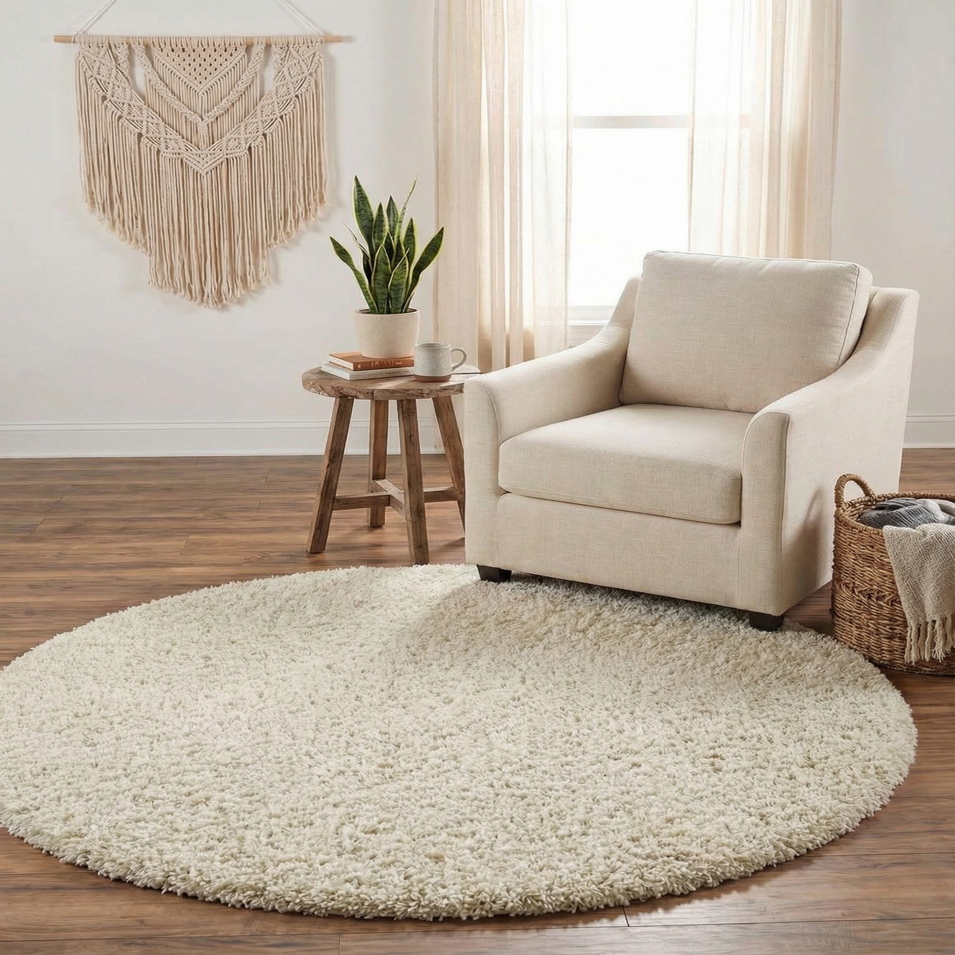 A plush, high-pile shag in Pure Ivory, this round rug presents a clean, solid surface with a dense, cloud-like texture. Running your hand across the fibers reveals a soft, slightly tousled pile that retains a casual, lived-in look while keeping a refined, monochrome presence. The minimal, pattern-free design lets the soft ivory color and tactile depth take center stage, making the rug easy to layer with other textures and finishes.