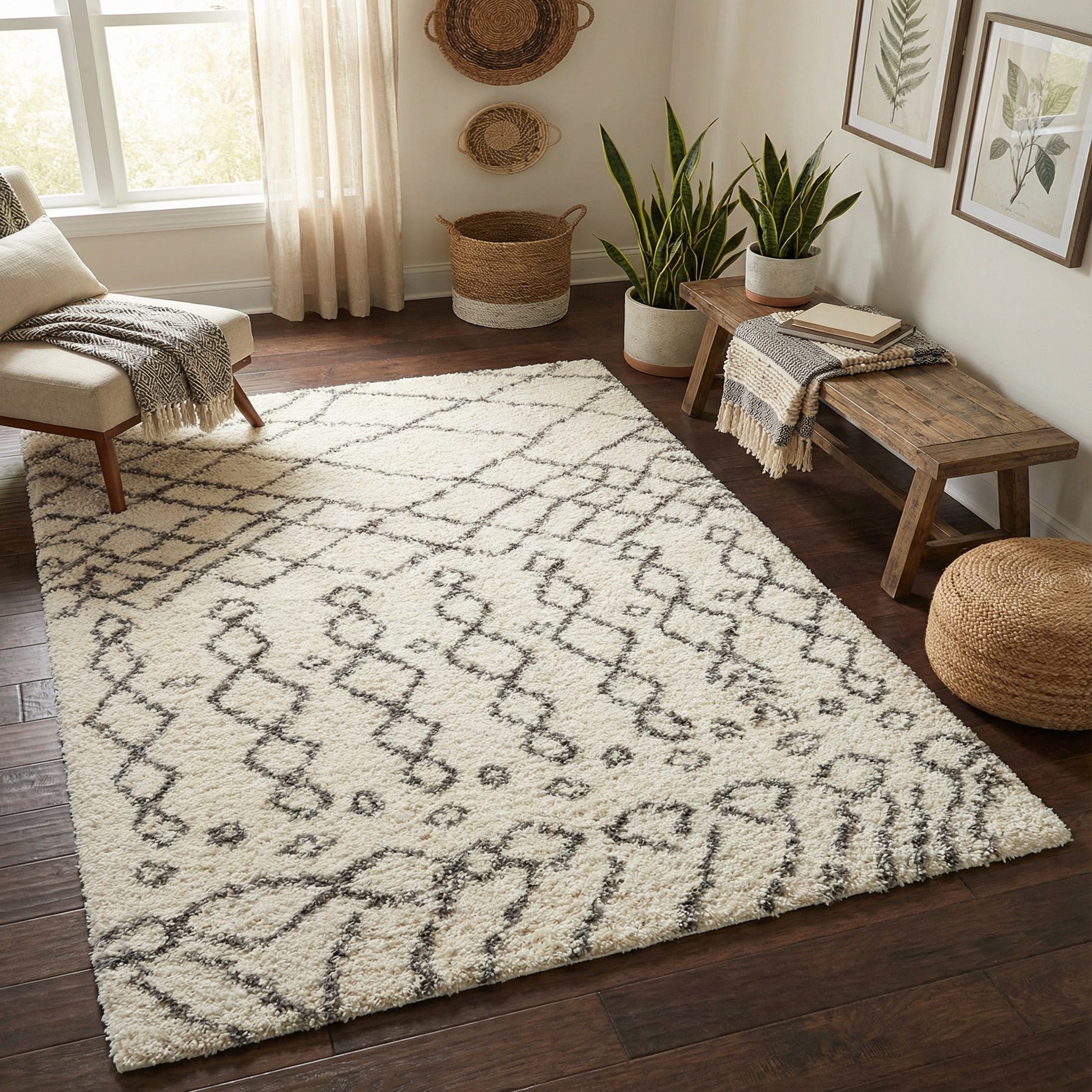 This rug works well as an anchor for a casual living area beneath a low-profile sofa and coffee table, layered in a bedroom to soften hardwood floors, or placed in a nursery or reading nook for added warmth. Its neutral Pure Ivory and Gray palette pairs easily with warm wood tones, matte metal accents, soft linens and muted pastels, complementing boho, Scandinavian, and modern farmhouse interiors.