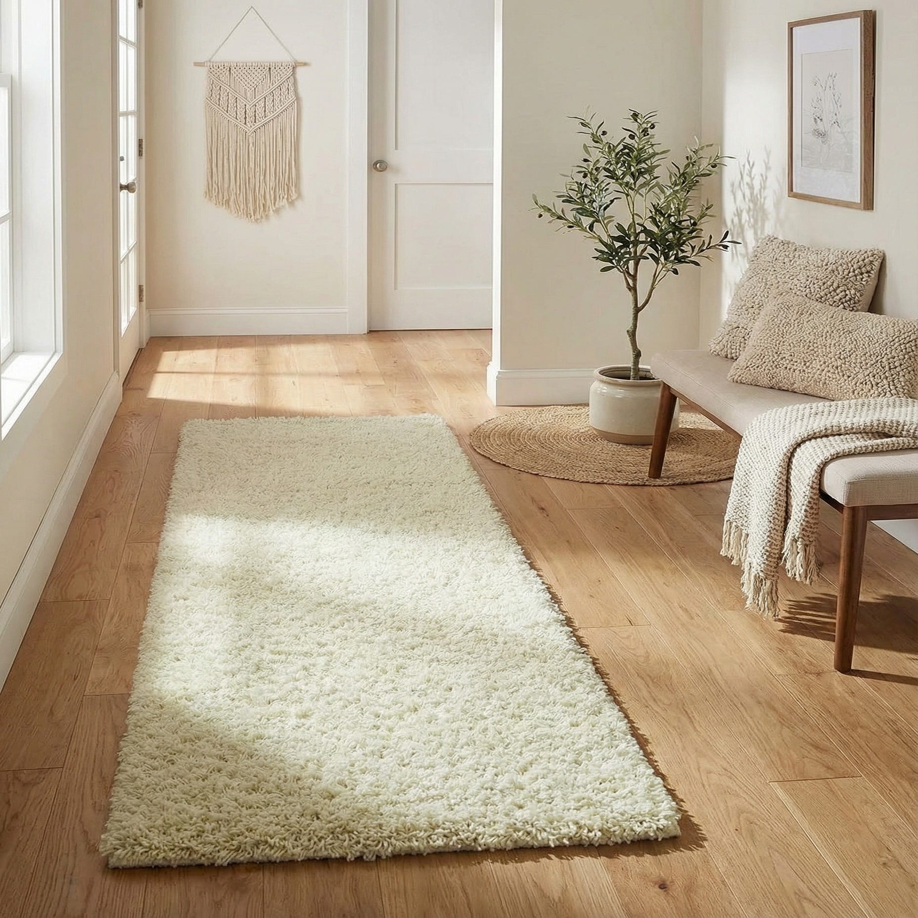 The deep, cushiony pile feels warm and inviting underfoot, making it ideal as a runner in hallways or narrow spaces, beside a bed, or along a kitchen aisle. Its neutral tone and casual shag styling suit modern minimal, Scandinavian, coastal, or contemporary interiors—pair it with natural woods, streamlined furniture, or layered textiles to add softness and light to the room.
