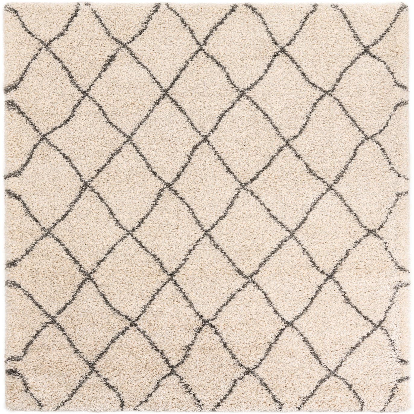 This Moroccan Shag rug, measuring 6x9 feet, is machine woven from 100% polypropylene, offering a combination of durability and soft textural appeal. The rug's high pile creates a plush, comfortable feeling underfoot, enhancing its cozy shag texture. Featuring a pure ivory background, the design is complemented by a gray diamond lattice pattern that provides a modern take on classic Moroccan motifs.