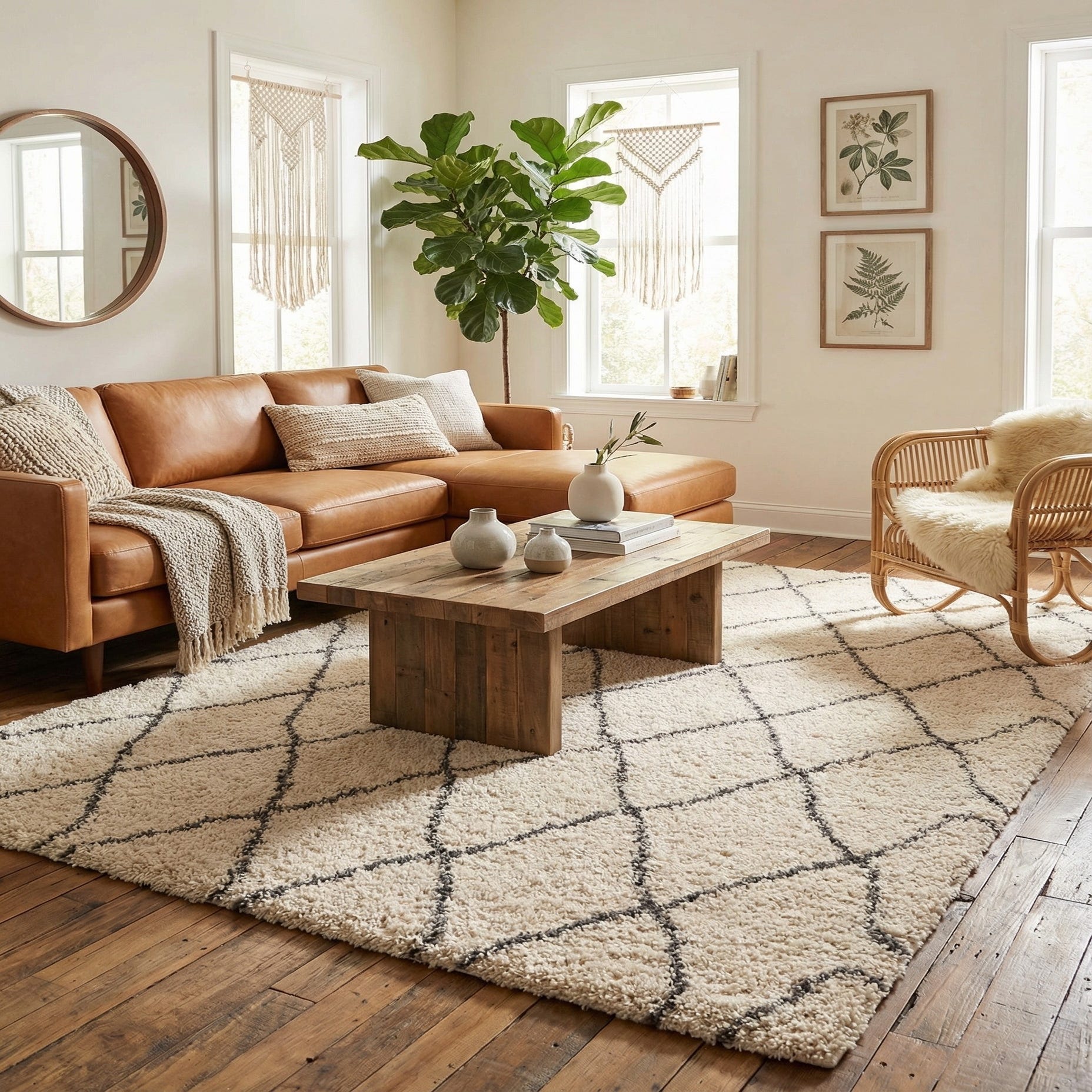 The Moroccan Shag rug's simple yet striking pattern can serve as a subtle focal point in a living room, soften the look of a home office, or add warmth to a bedroom setup. Its straightforward design allows it to integrate with both muted and colorful decorative elements without competing for attention.