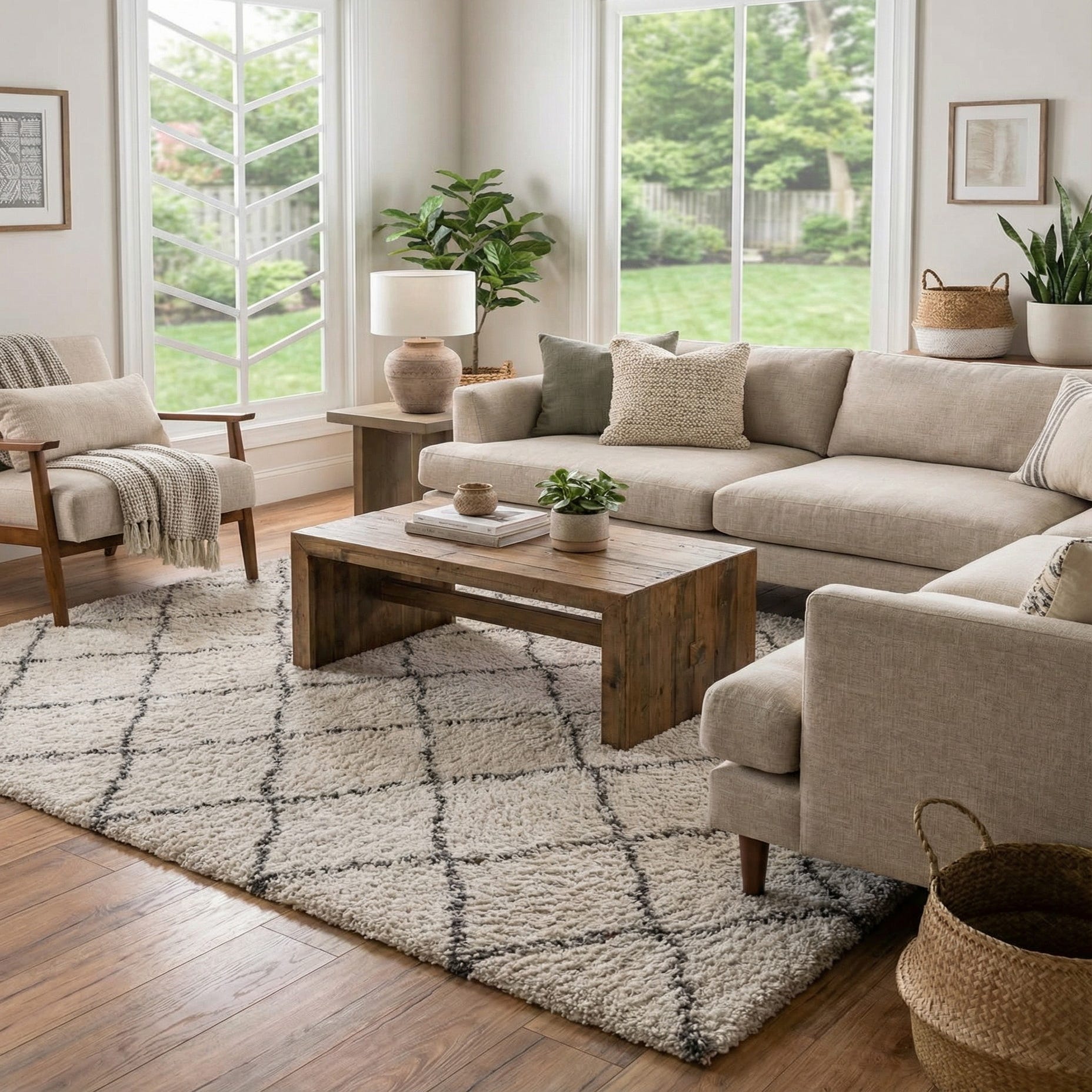 The neutral palette and gentle geometric motif make this rug easy to place throughout the home: anchor a living room seating area with light-wood or mid-century pieces, layer it under a bed for added warmth and softness, or use it to soften a contemporary home office. Its relaxed, Moroccan-inspired pattern pairs well with linen textiles, matte metals, and natural textures for a comfortable, modern aesthetic.