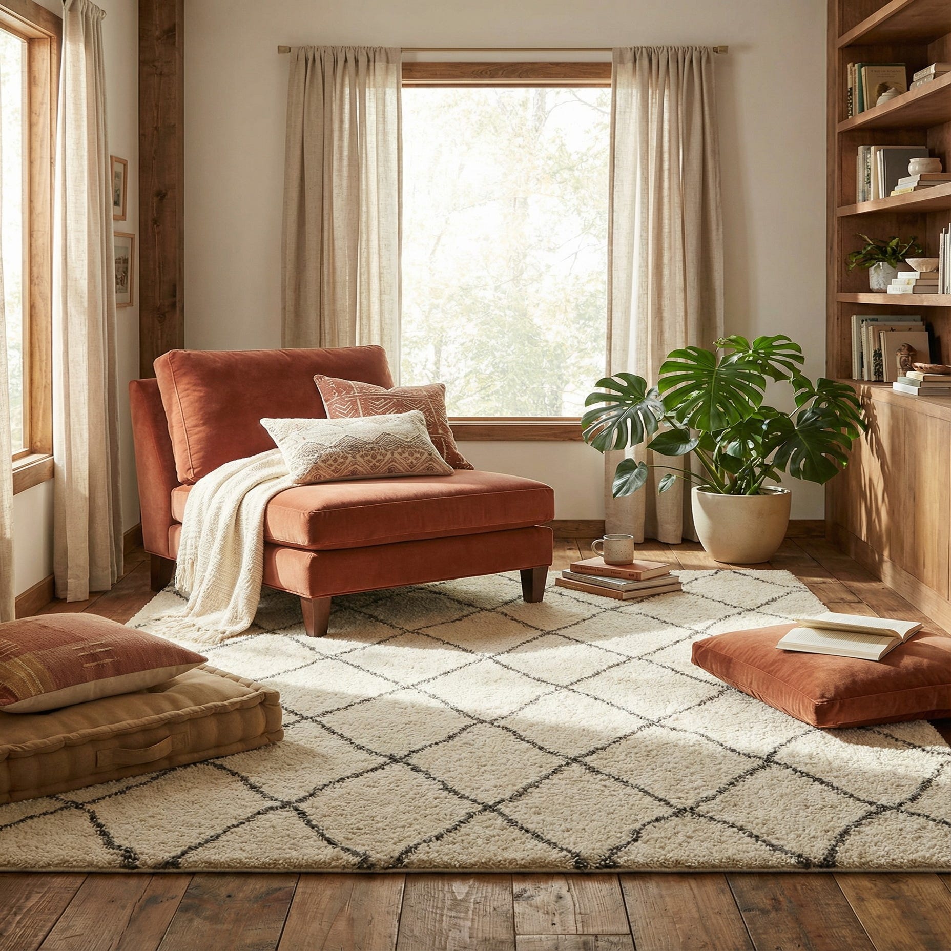 The texture of the rug is rich and inviting, with a shaggy pile that provides a soft and cozy underfoot experience. The simplicity of the pure ivory field is elevated by the gray diamond trellis pattern, which adds visual interest without overwhelming a room's aesthetic.