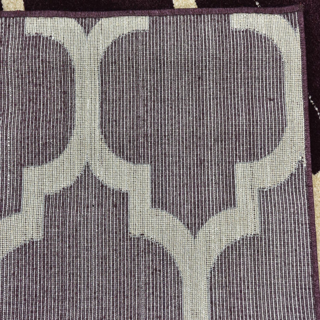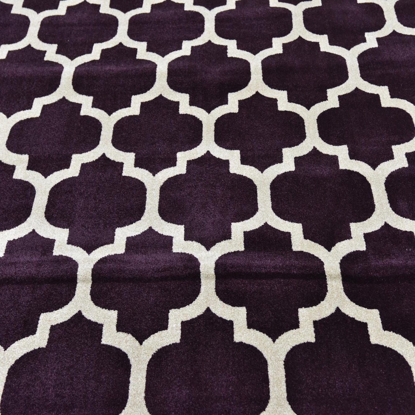 Given its generous dimensions and impactful color scheme, this piece could serve as an anchoring element in a spacious living room, den, or dining area. It would complement neutral furnishings, allowing the purple hue to serve as an eye-catching focal point, or it could be paired with complementary colors for a cohesive, richly layered look. Accents of gold or brass in the decor would bring out the warm undertones of the rug's ivory pattern, while its geometric precision lends itself well to contemporary and transitional spaces.