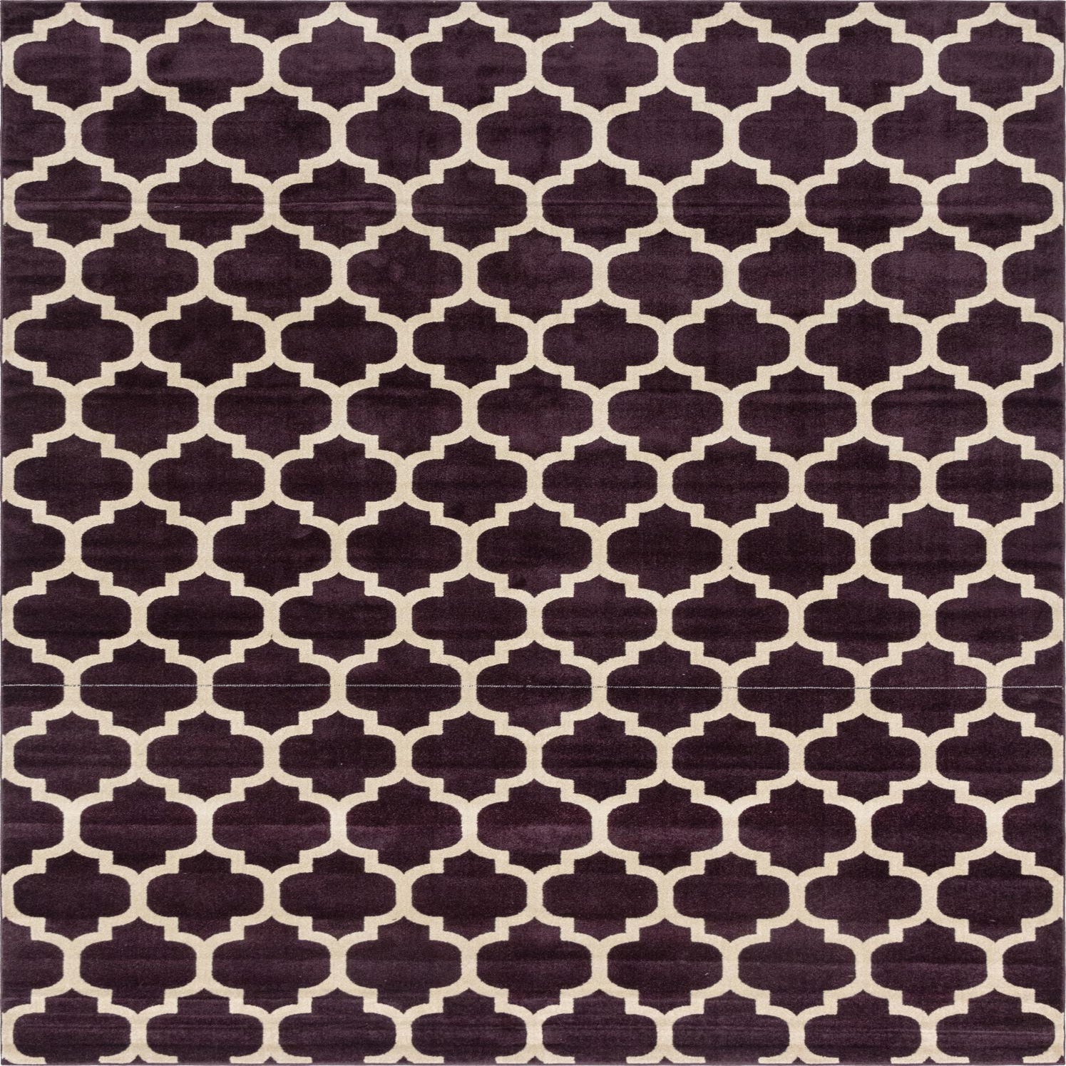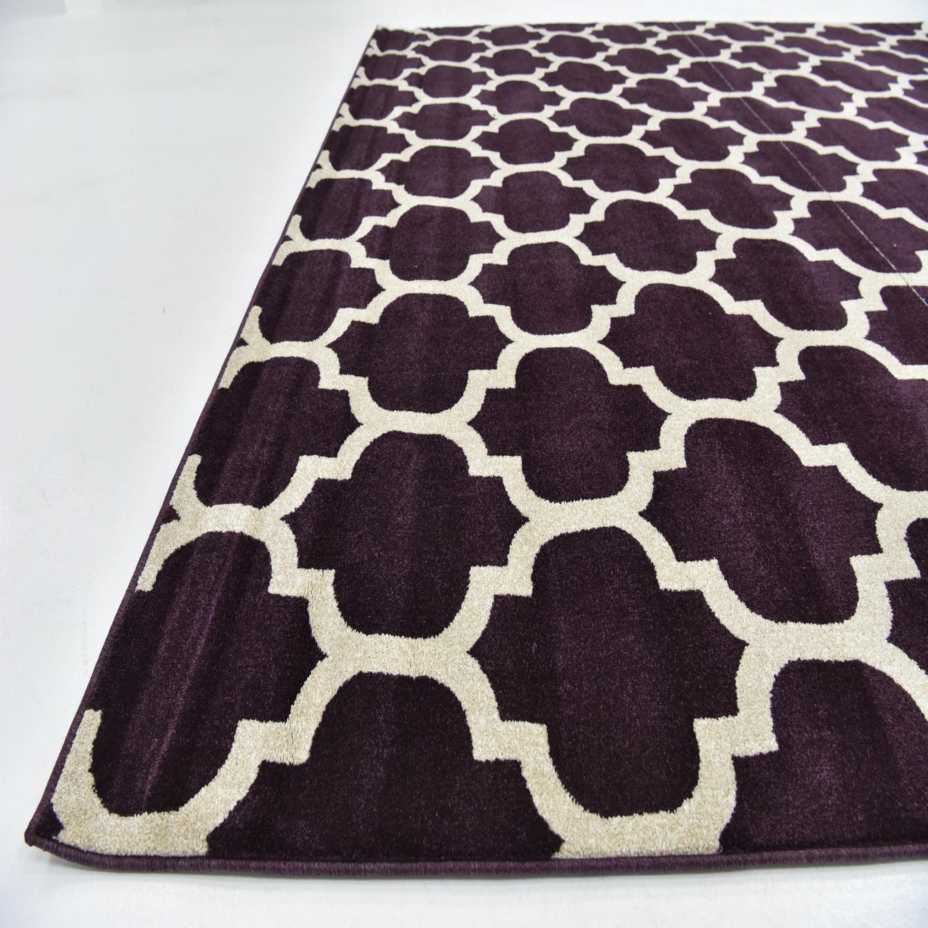 The Lattice collection presents a 10x13 rug featuring a bold, purple background with an ivory geometric pattern. Machine woven of 100% polypropylene, this rug offers a durable and low-maintenance surface with a plush texture. The repeated lattice design imparts a modern yet classic aesthetic suitable for various interior themes.
