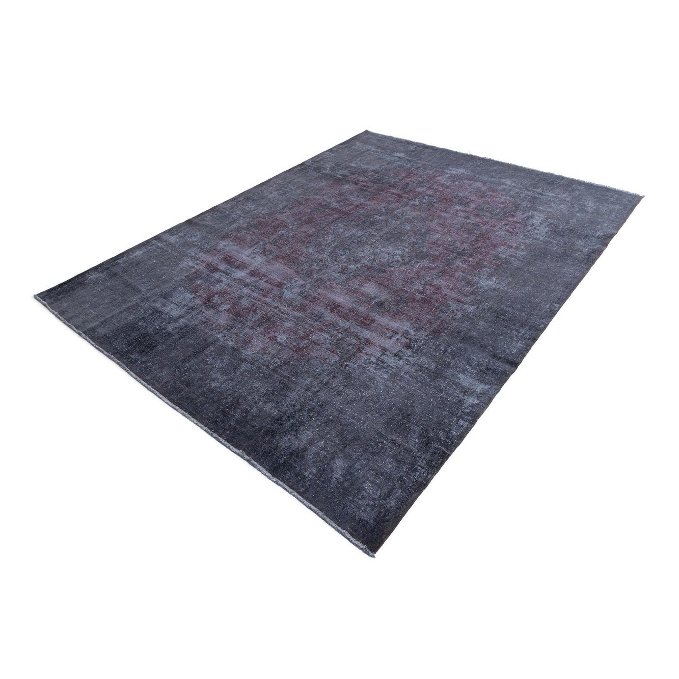 Hand made of 100% wool, this rug presents a vintage-inspired medallion softly worn into a deep purple field. Layers of violet and black weave through the design, producing subtle tonal shifts and a gently distressed look that reveals ornate motifs without sharp contrast. The short, dense pile feels plush and slightly velvety to the touch, and variations in the surface catch light to accentuate the rug’s muted pattern and low-sheen finish.