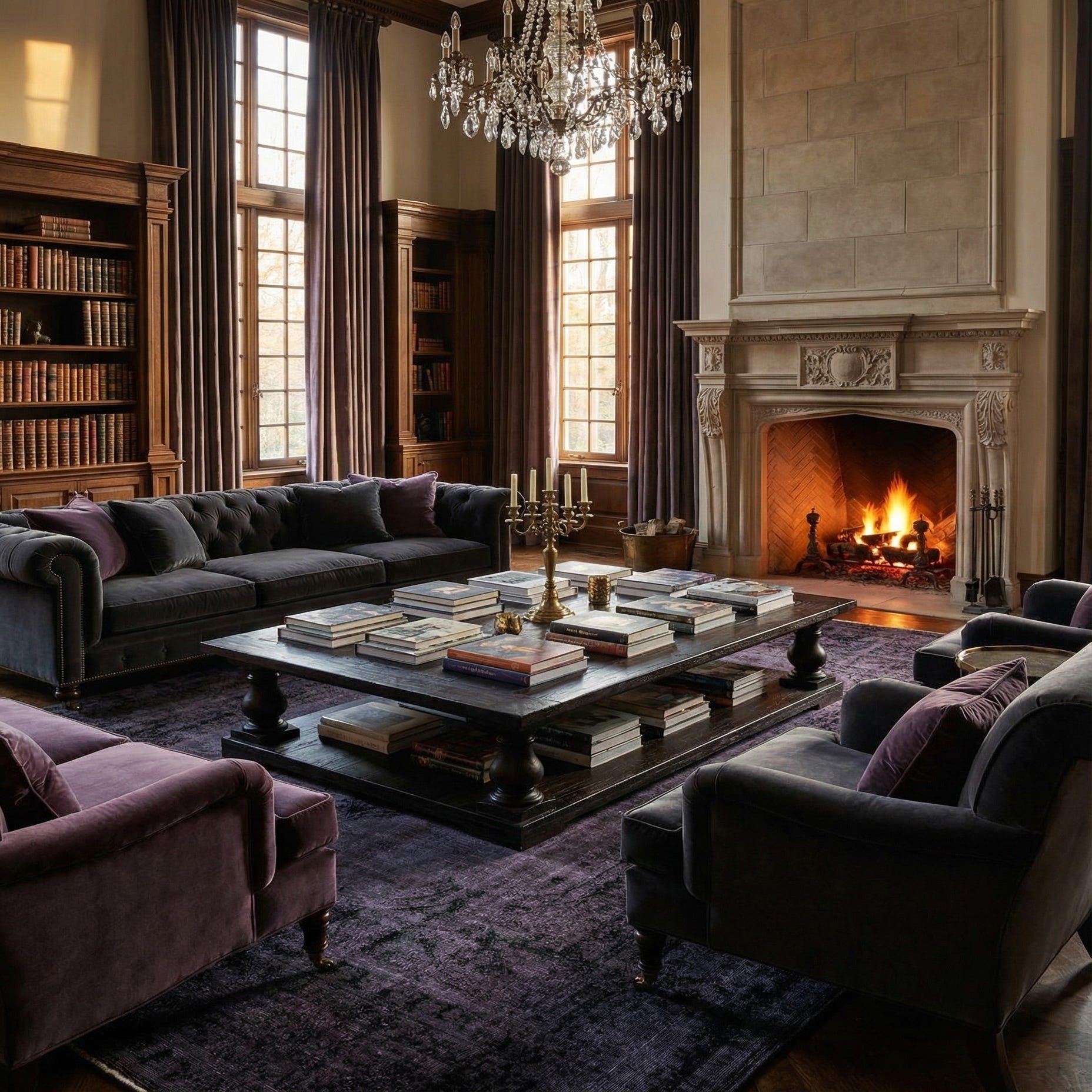 A 10x13 rectangular purple wool area rug with a distressed traditional medallion pattern, ideal for a living room.