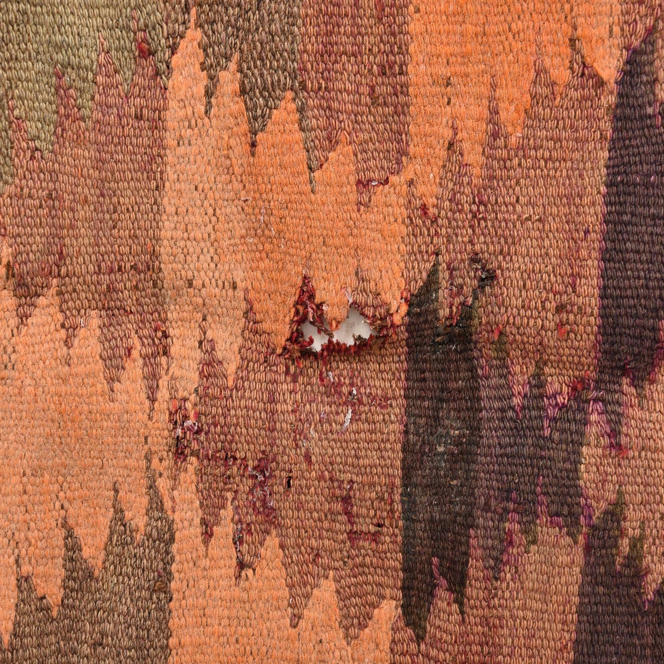 A 11 ft runner rug featuring a vibrant geometric pattern in shades of purple, orange, brown, and grey, ideal for a hallway.