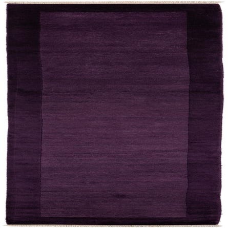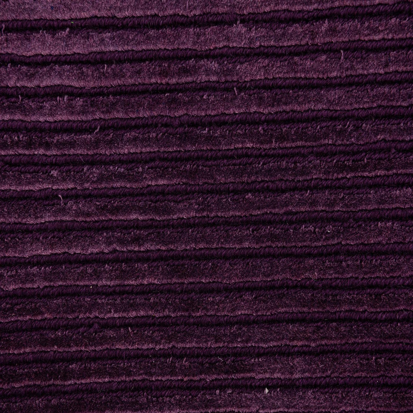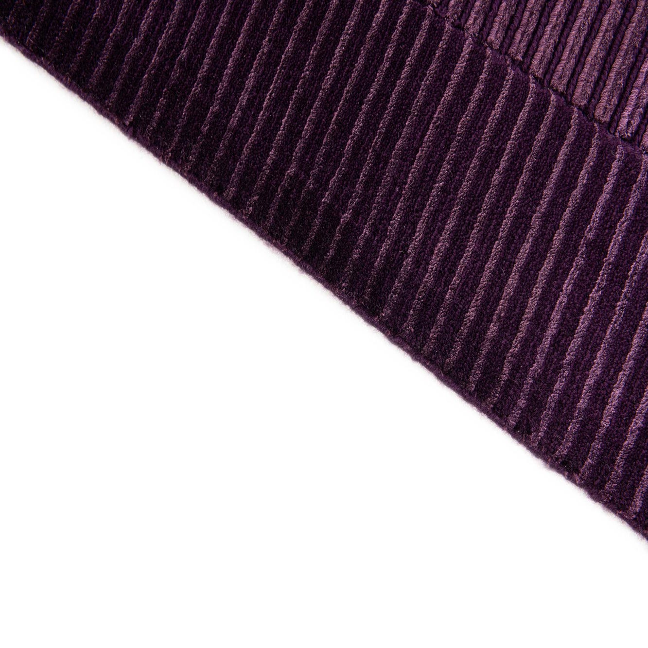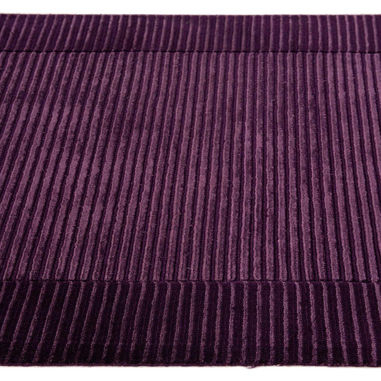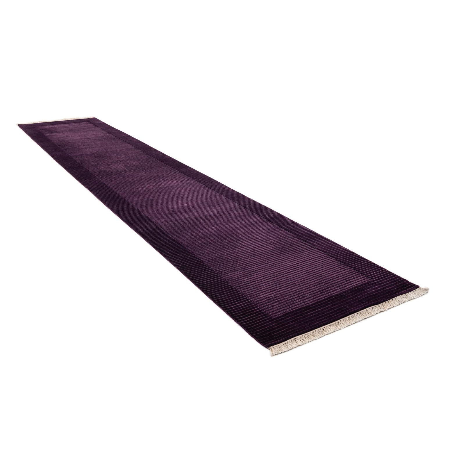 A 13 ft Darya runner rug in varying shades of deep purple with a modern striped pattern, handmade from wool and cotton.