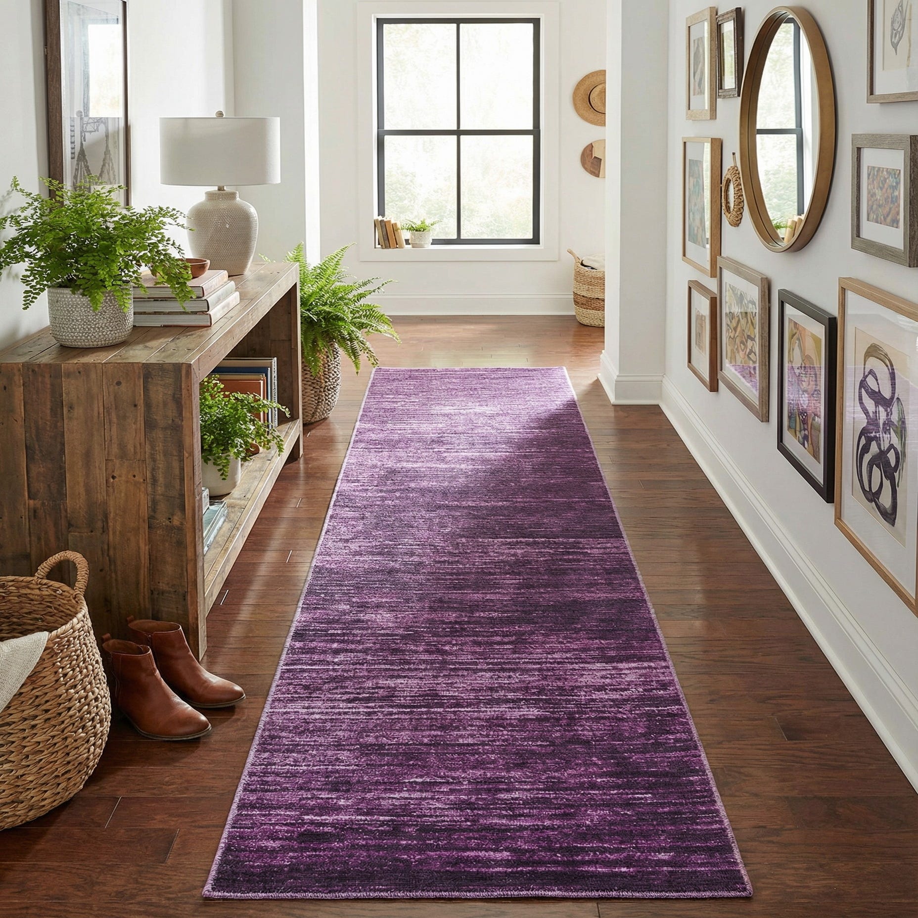 A rich purple field is gently washed with irregular ivory striations that create a softly distressed, linear pattern across the runner. The tonal variations give the surface depth and movement, while the subtle contrast between purple and ivory keeps the look modern and approachable. Machine-made from 100% chenille, the pile has a velvety hand and low to medium profile that offers a soft, slightly lustrous finish underfoot.
