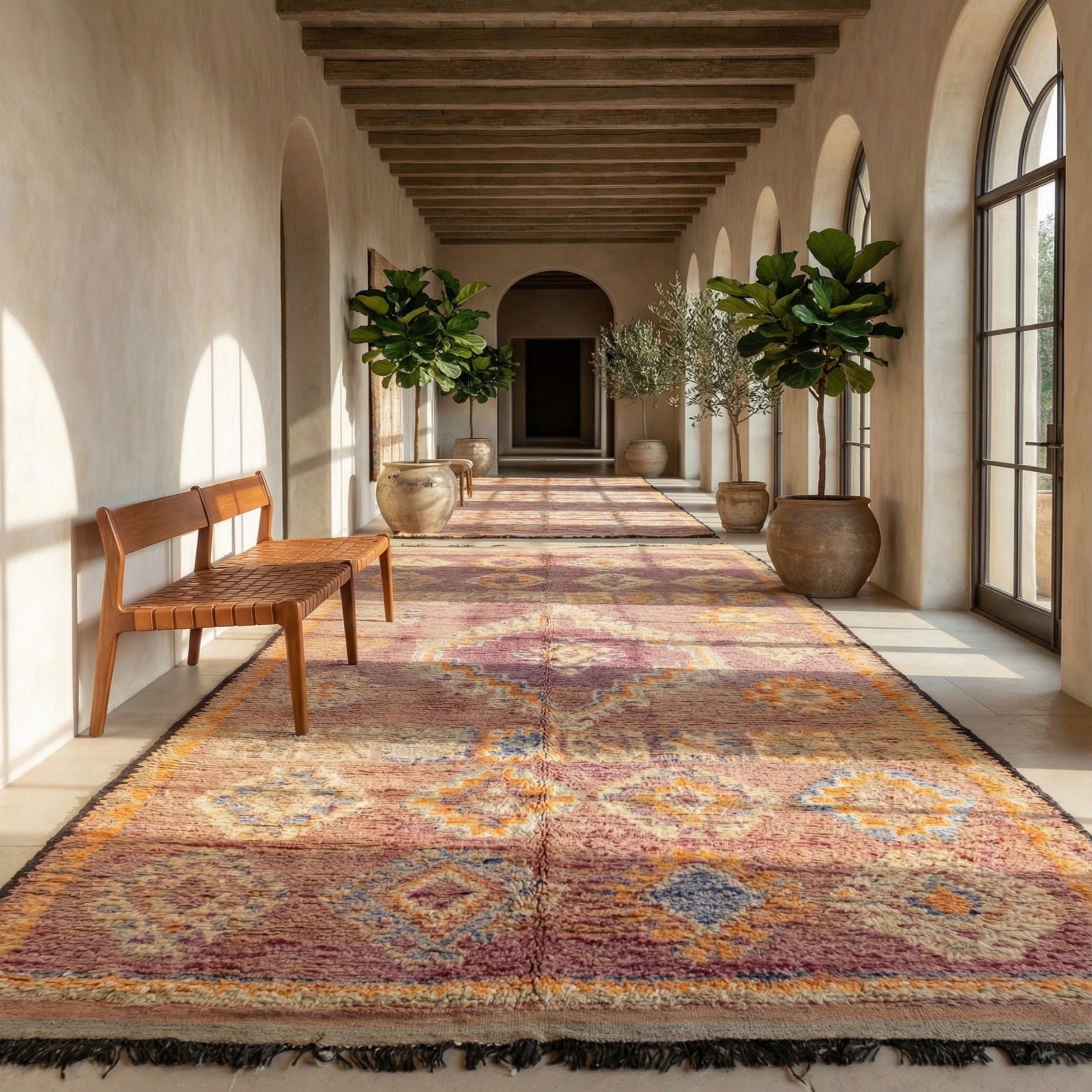 Place this runner in a hallway or entry to add warmth and directional interest, or use it beside a bed to create a soft landing. It pairs especially well with natural wood tones, leather, or rattan for a layered, lived-in look, and fits bohemian, eclectic, or modern interiors that benefit from a tactile, patterned element. For a cohesive palette, combine with neutral upholstery and accent with cushions or lamps in peach or violet tones to echo the rug’s colors.