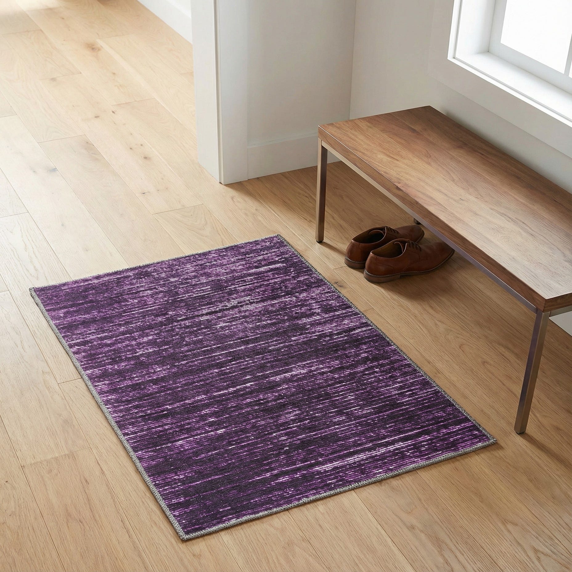 This piece works well in small seating nooks, beside a bed, or layered over a larger neutral rug to bring color and texture without dominating the room. Pair it with mid-century wood furnishings or black metal accents for a modern look, use it to anchor an eclectic space with jewel-toned accessories, or add it to a minimalist palette where the rich purple and ivory highlights become the focal point. The soft chenille pile makes it inviting underfoot and suited to areas where comfort and color matter.