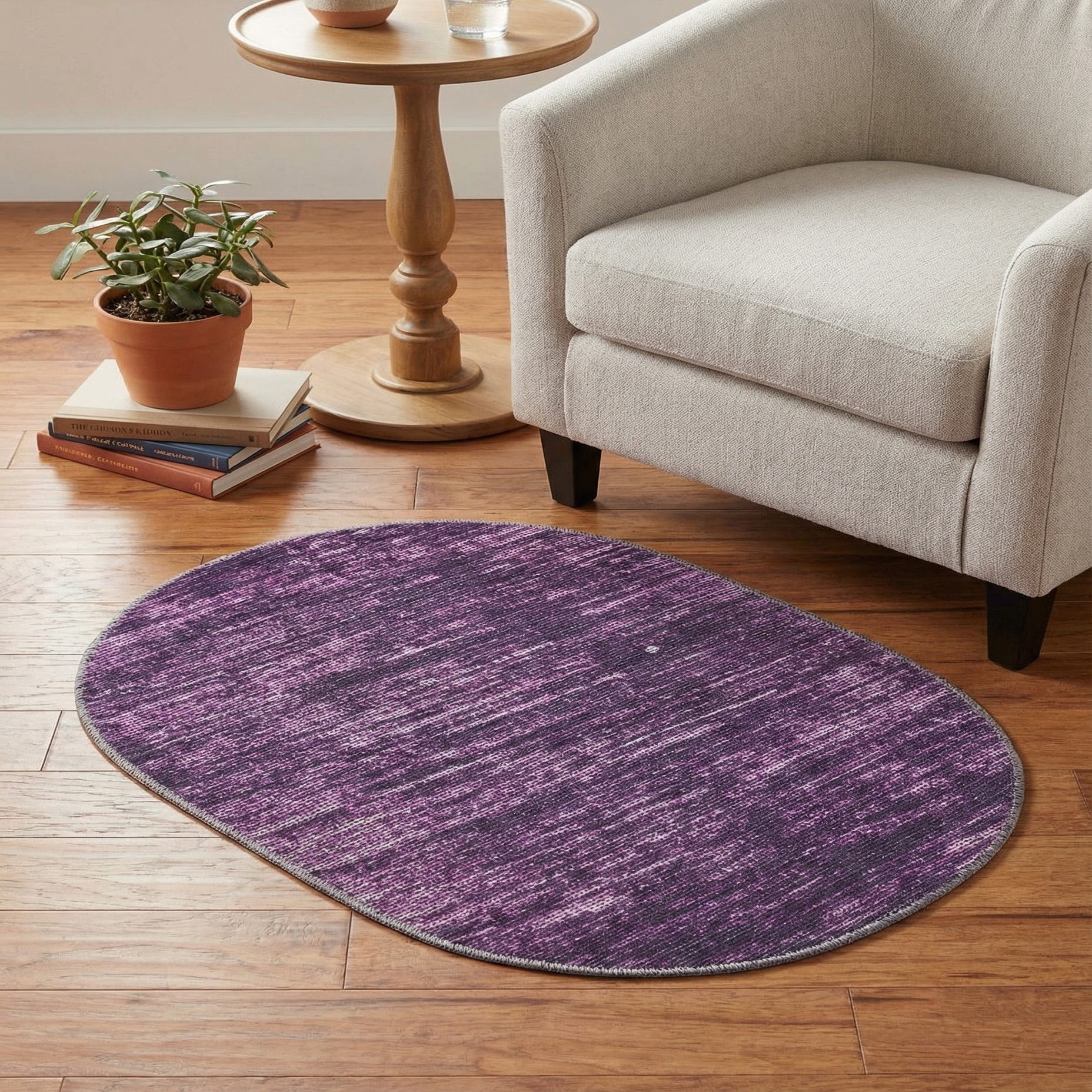 A rich purple ground provides the backdrop for a subtle, horizontal striation pattern in ivory that gives this oval rug a lived-in, textile-like appearance. The variegated effect is created by fine, irregular streaks and tiny flecks of ivory across the purple base, producing low-contrast visual texture that reads modern yet relaxed. Machine made from 100% chenille, the surface has a soft, velvety hand with a gentle sheen and a low-to-medium pile that feels plush underfoot without overwhelming a smaller space.