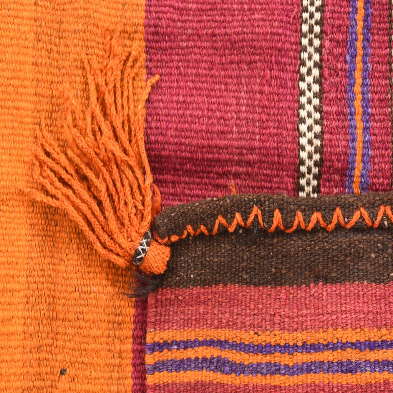 The Kilim Afghan is a hand-woven rug composed of 100% wool, offering a durable and tactile surface. This particular 3 Ft Square piece showcases a vibrant purple background, complemented by accents in brown, ivory, and orange. It features a traditional kilim design characterized by its flat-weave construction, geometric motifs, and bold, linear patterns. The presence of fringe adds a classic finishing touch.