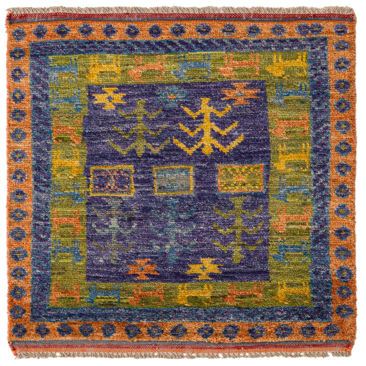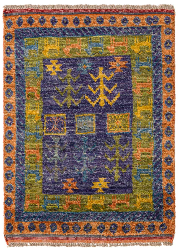 Primary color is Purple. Colors in this rug include: Purple, Green, Yellow, Orange.