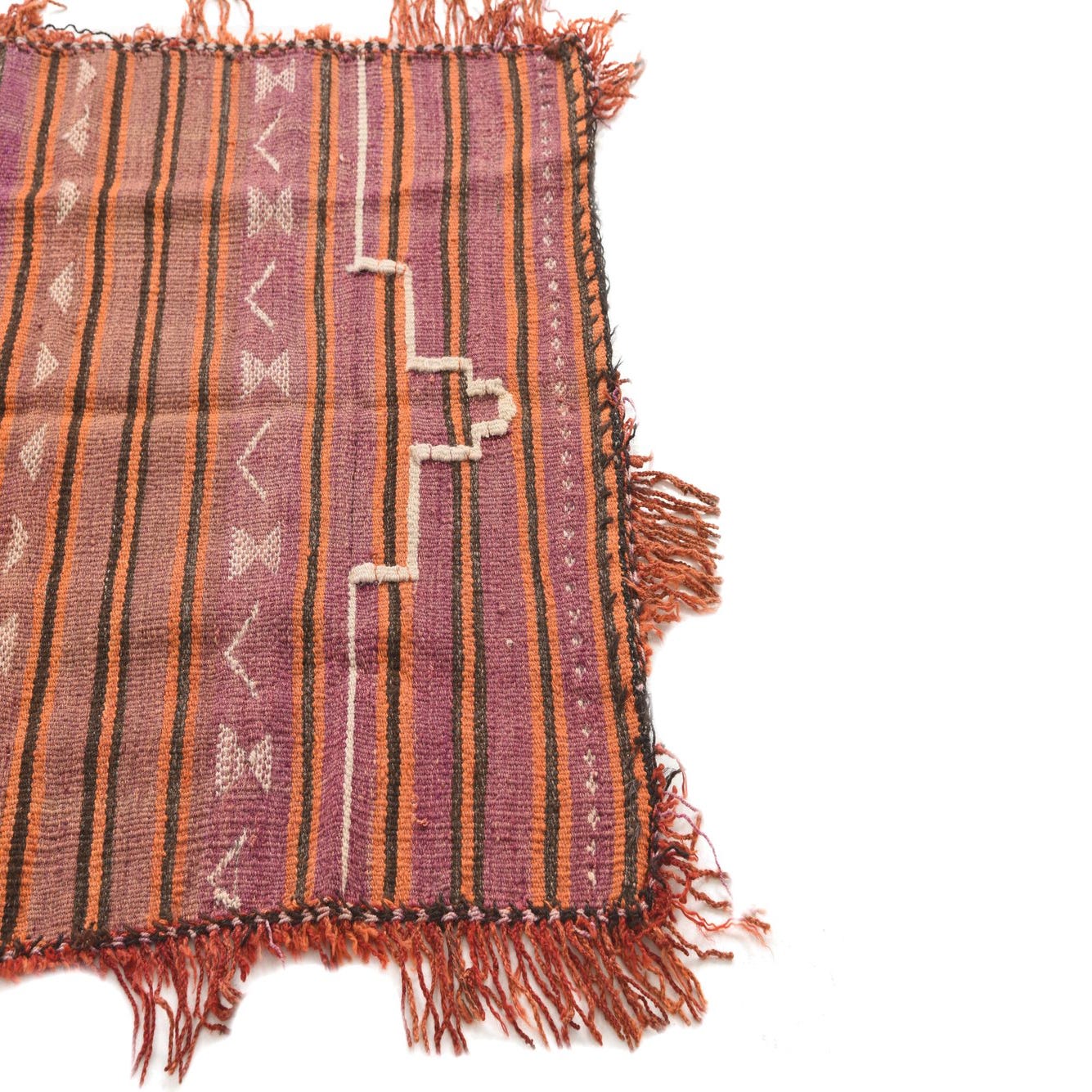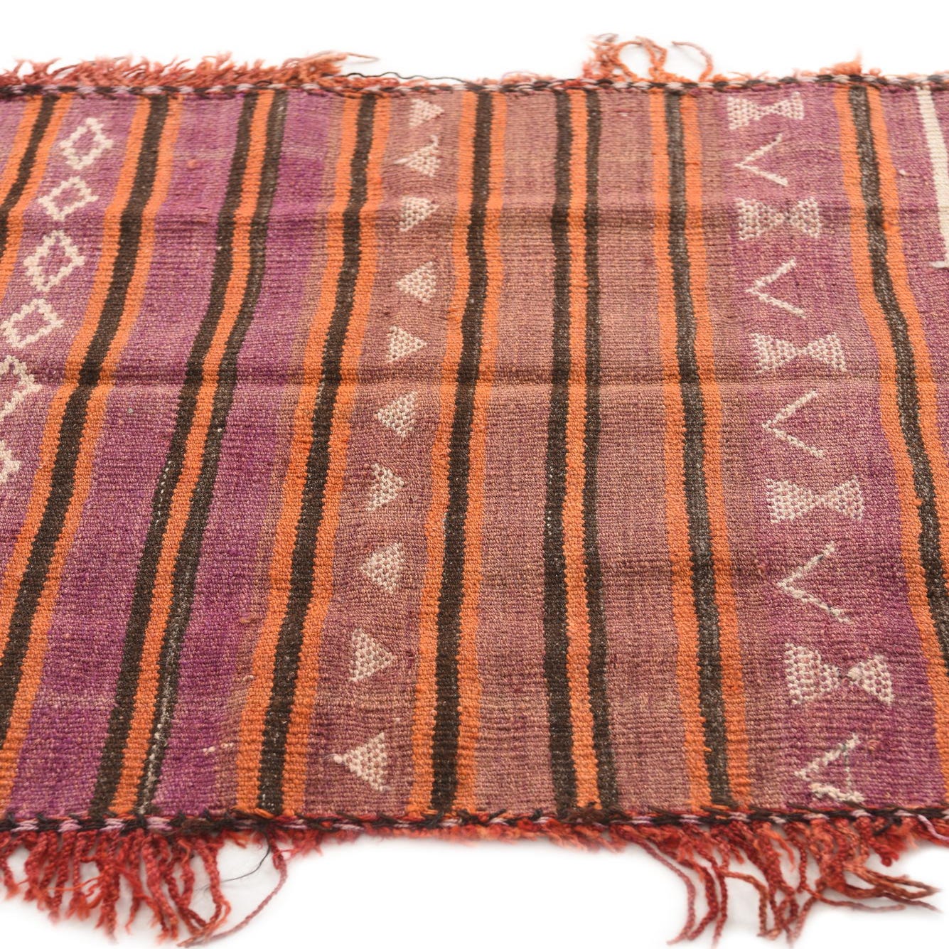 A 3x4 rectangular flatweave rug featuring purple, orange, and black stripes with tribal patterns and red fringe.