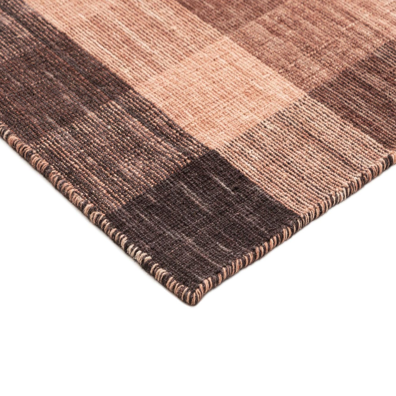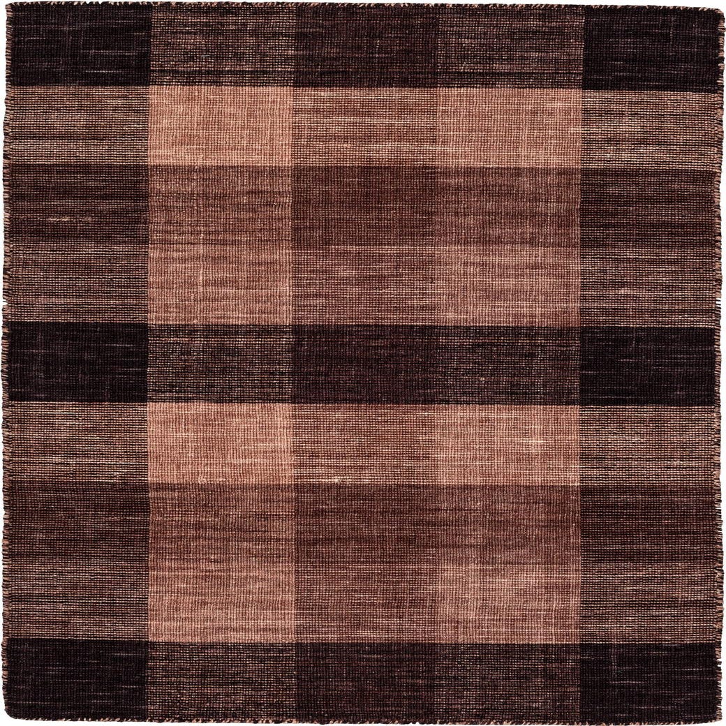 A 3x5 rectangular modern Gabbeh rug in varying shades of purple, featuring a large plaid or checkerboard pattern.