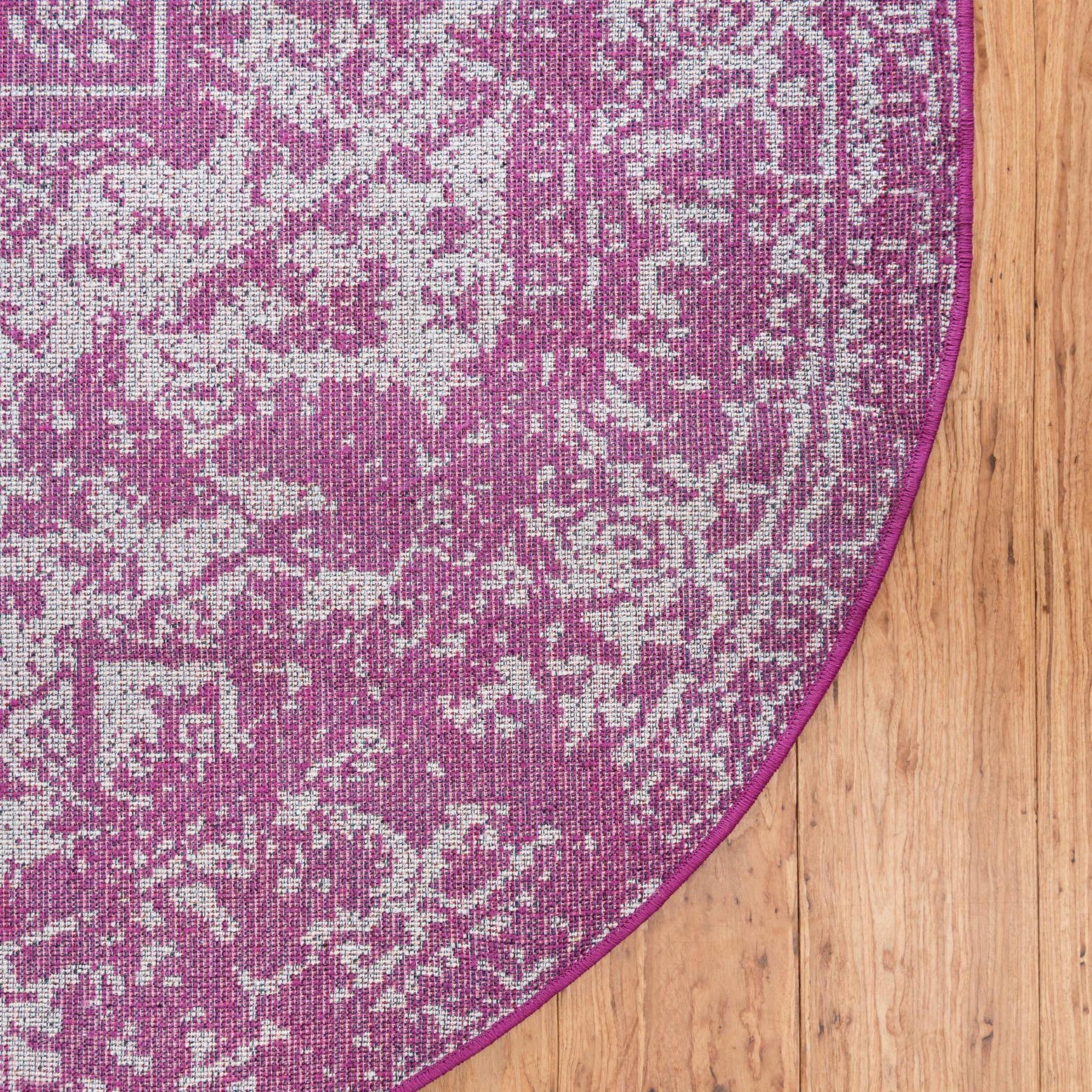 A rich purple background anchors an ivory, distressed medallion pattern that blends traditional Oriental motifs with a softened, vintage-inspired finish. The central medallion and surrounding field are articulated in ivory against variegated purple, creating clear contrast while the worn, irregular detailing gives the design a relaxed, lived-in character. The oval silhouette further softens the look, making the pattern feel balanced and intentional in any room layout.