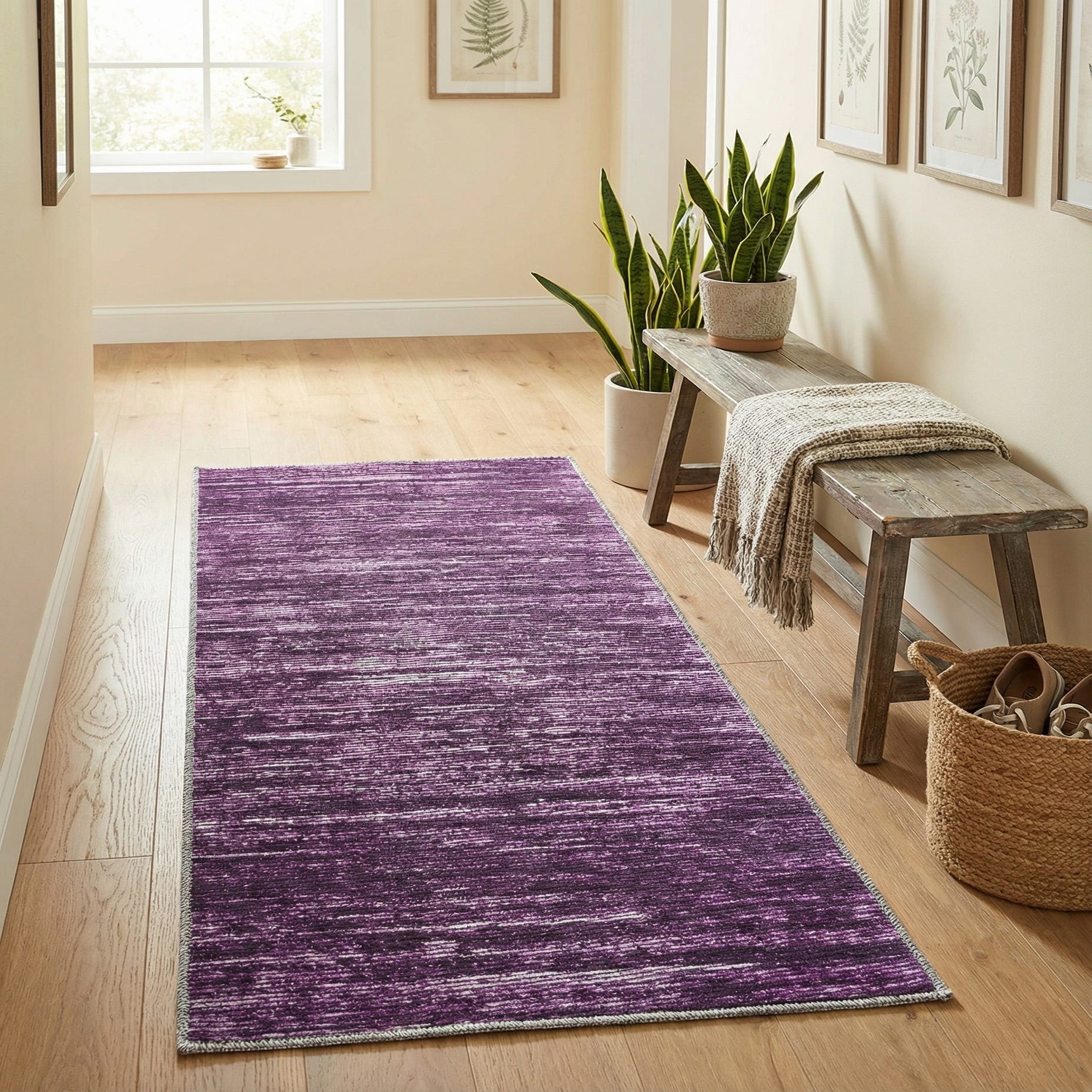 This runner works well in narrow or transitional spaces where a bold color can anchor the room—try it in a hallway, kitchen galley, or alongside a bed. Pair it with warm woods and neutral upholstery to let the purple pop, or place it in a modern space with metallic accents and clean-lined furniture for a more dramatic contrast. Its texture and tone also suit eclectic and contemporary interiors that benefit from a tactile, color-forward element.
