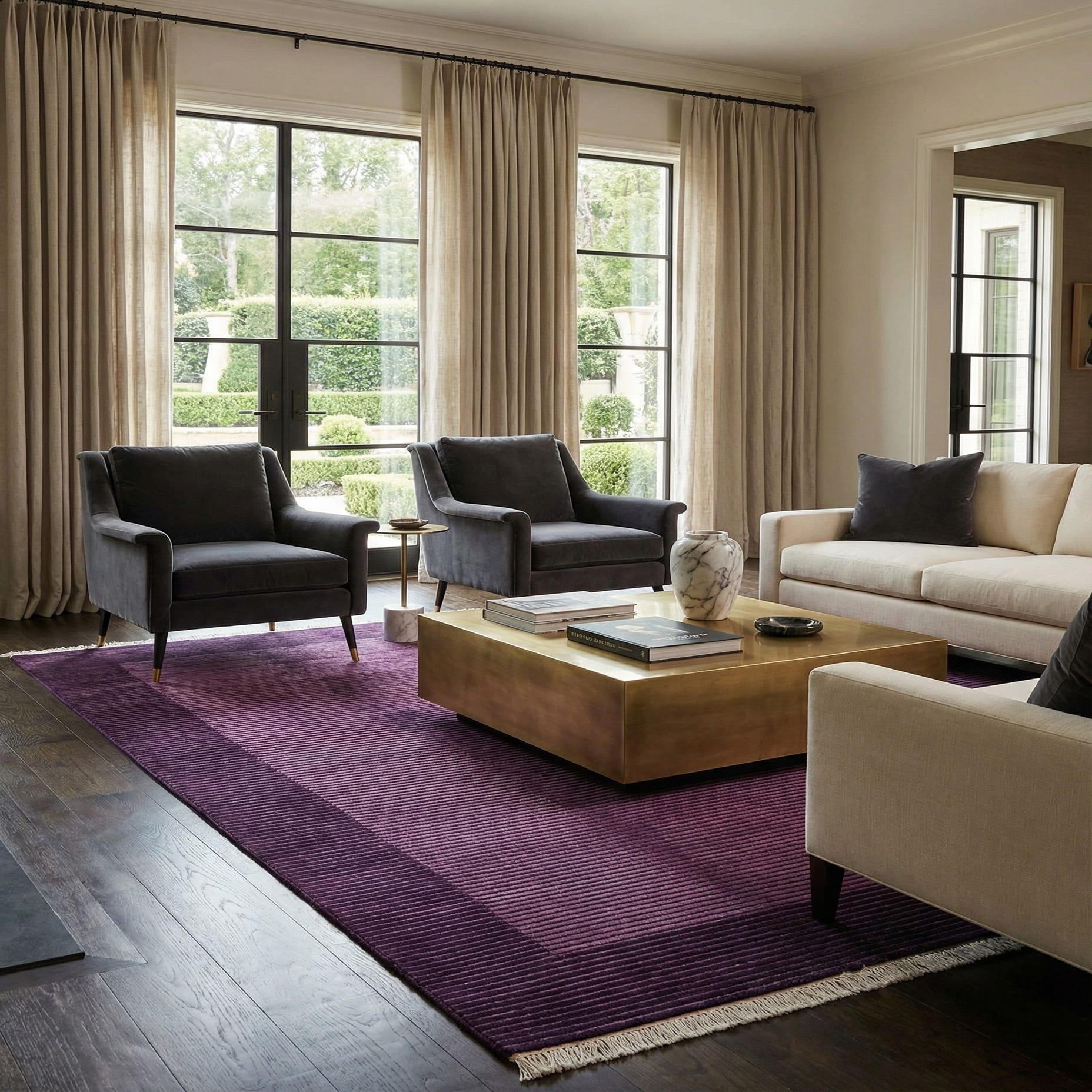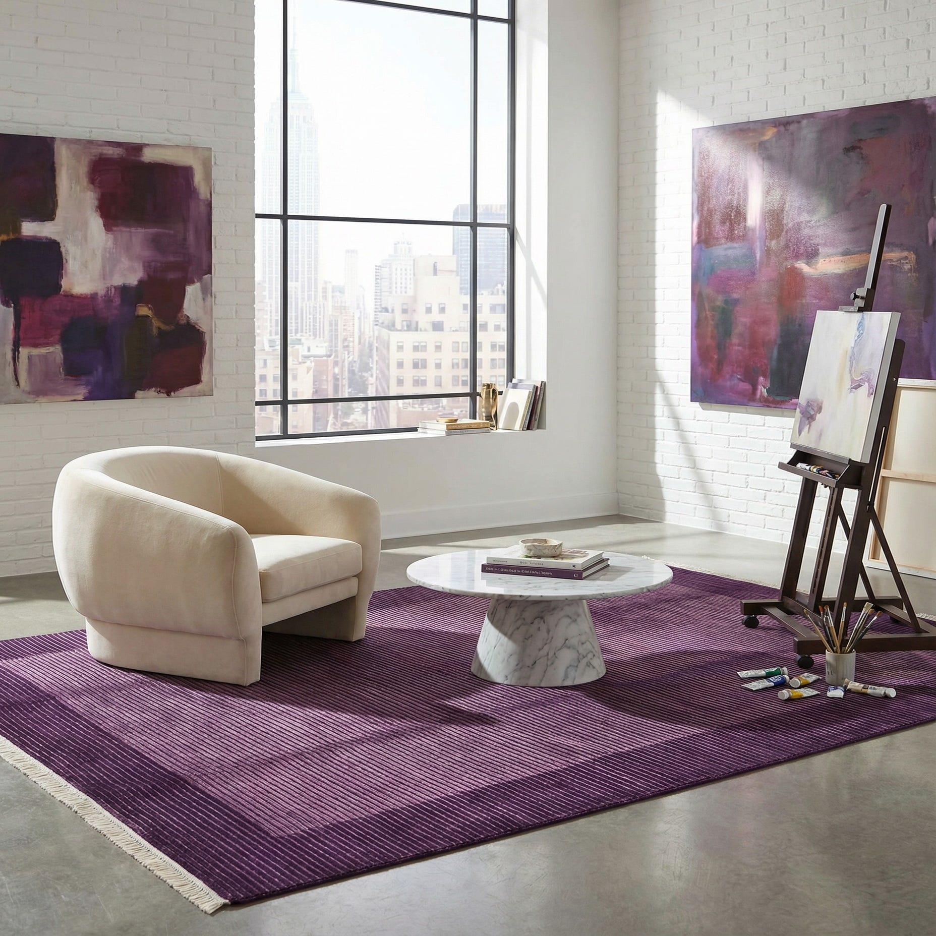 A 4x6 rectangular Darya rug in varying shades of purple, featuring a modern striped pattern and subtle border, ideal for a living room.
