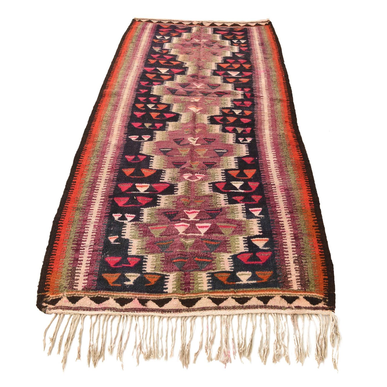 Crafted from 100% wool, the texture of this rug is indicative of authentic kilim craftsmanship, providing both durability and tactile appeal. The presence of a hole and missing fringe contributes to the rug's history, reflecting its journey through time.