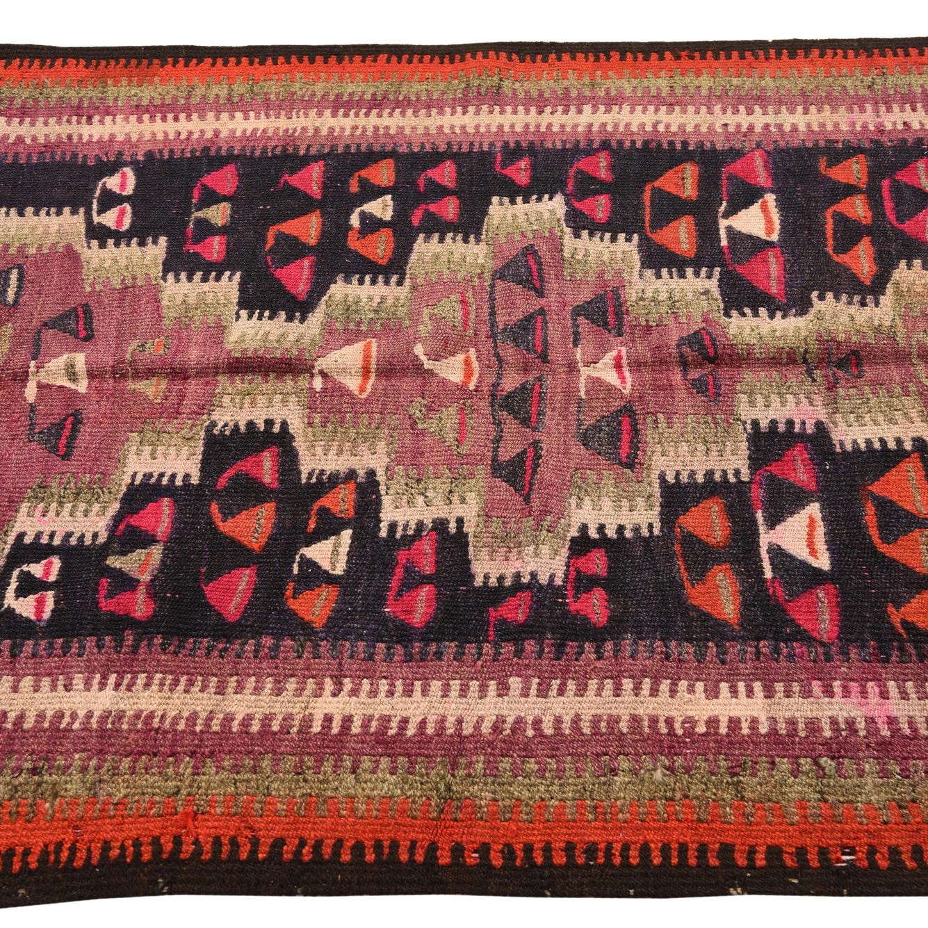 The Kilim Fars Collection offers a 4x6 hand-woven rug that is a genuine semi-antique piece, aged 40 to 60 years old. This rug features a dynamic pattern with a purple background, complemented by a vivid array of colors including black, ivory, olive, orange, red, and pink. The traditional kilim design showcases geometric shapes and tribal motifs, creating a sense of history and artistry.